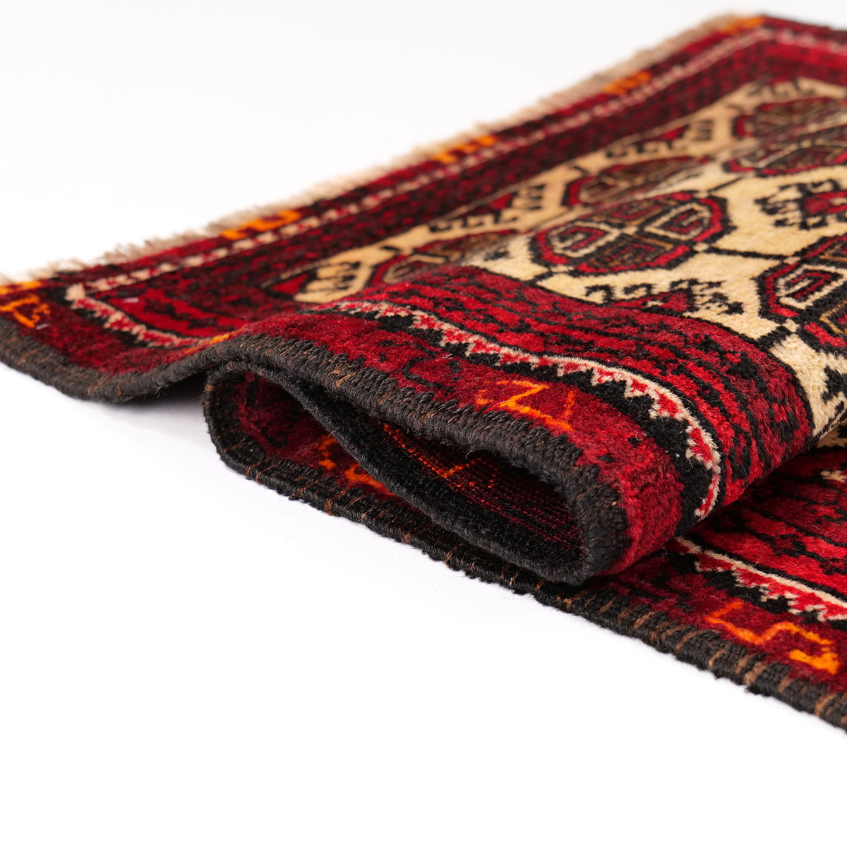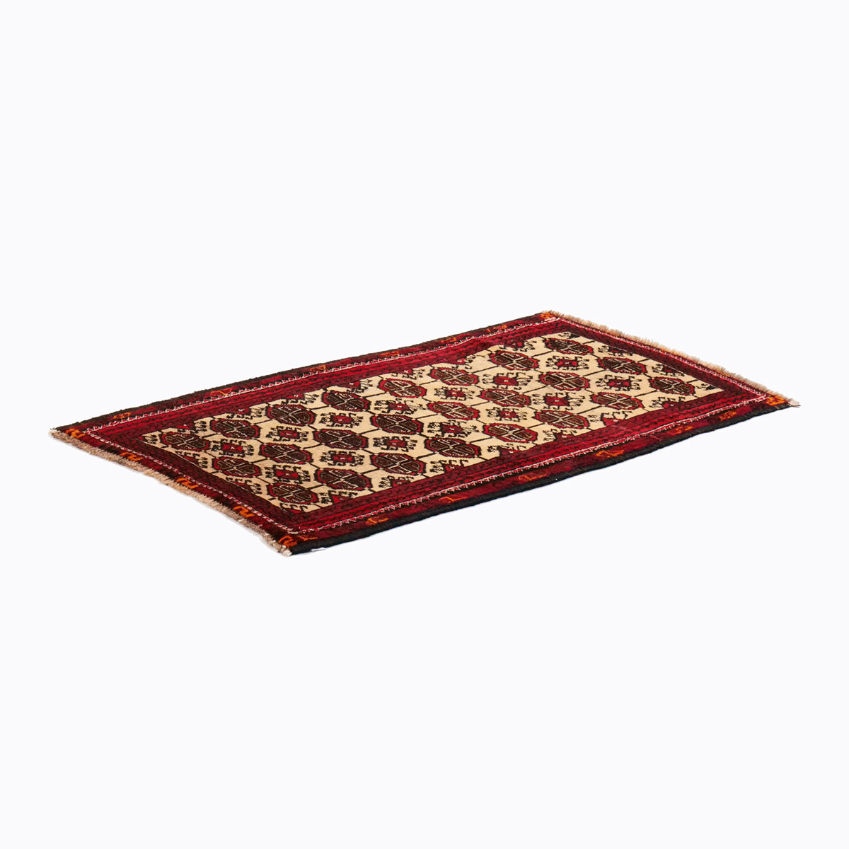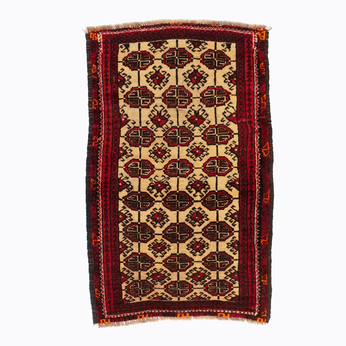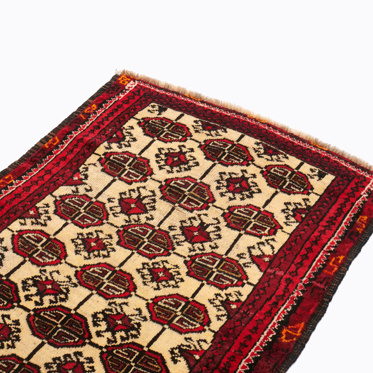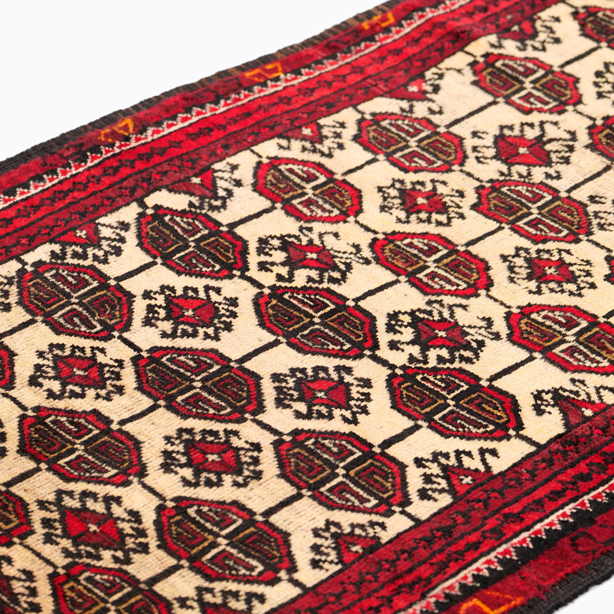 フィールドには、トルクメン部族の中でもエルサリ族に由来する「エルサリギュル」が繰り返し配され、力強さと安定感のある構成を形成しています。八角形の中に複雑な幾何構成を持つこの文様は、部族の象徴として古くから織り込まれてきた伝統的な意匠です。