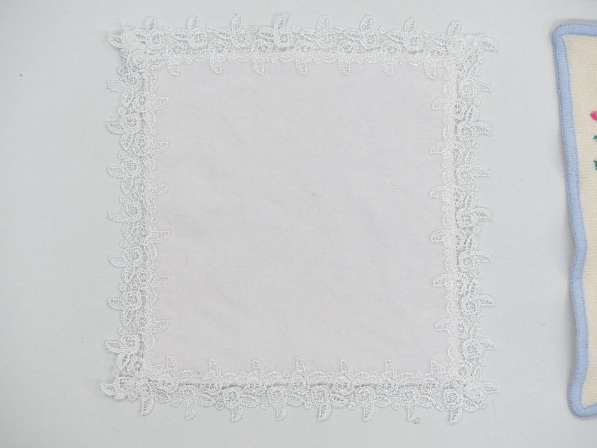 A/A- クリーニング済。ハンカチは型崩れや縮みが少し生じております。 近沢レース店は表側に小さなうすいシミ、裏側に糸引きがあります。 |