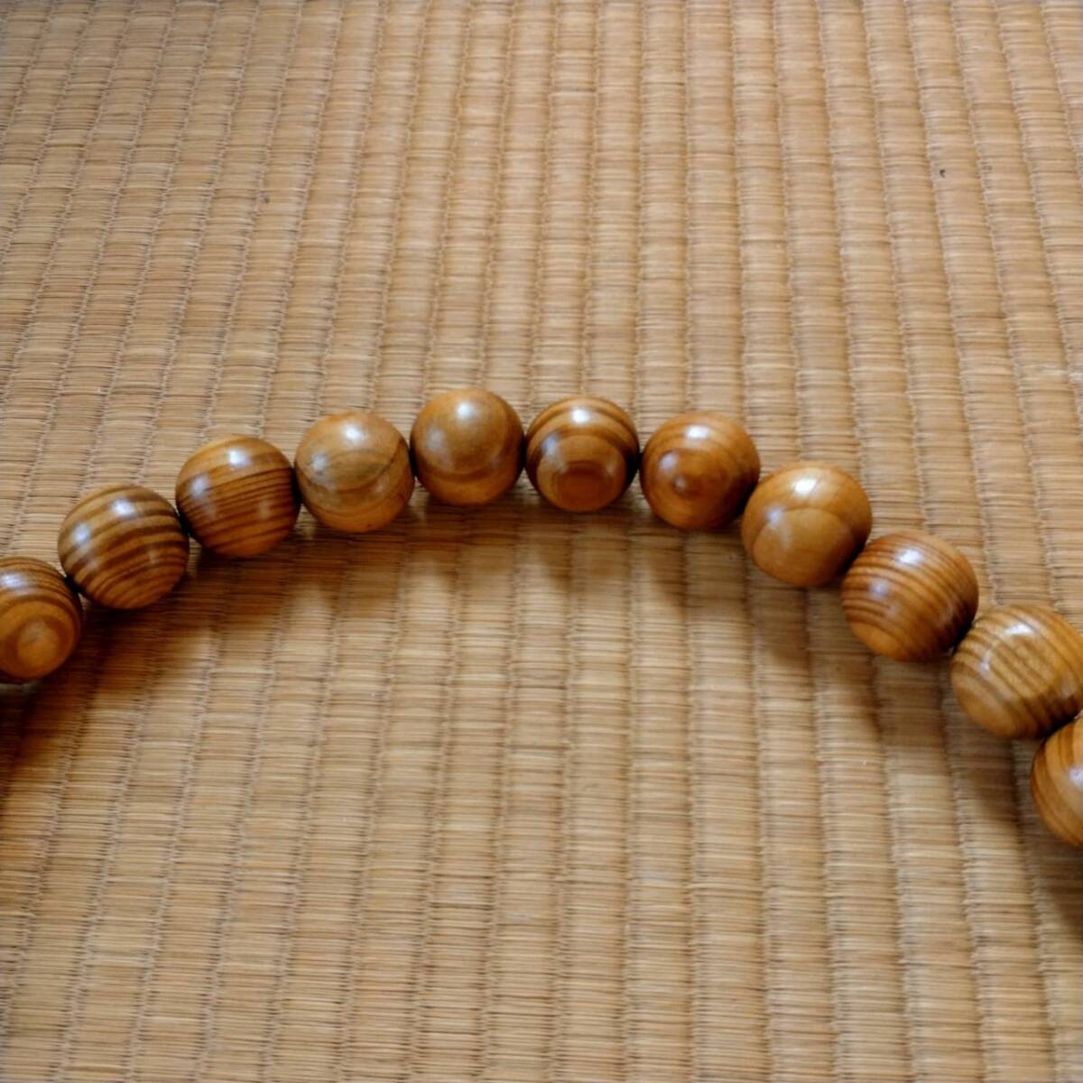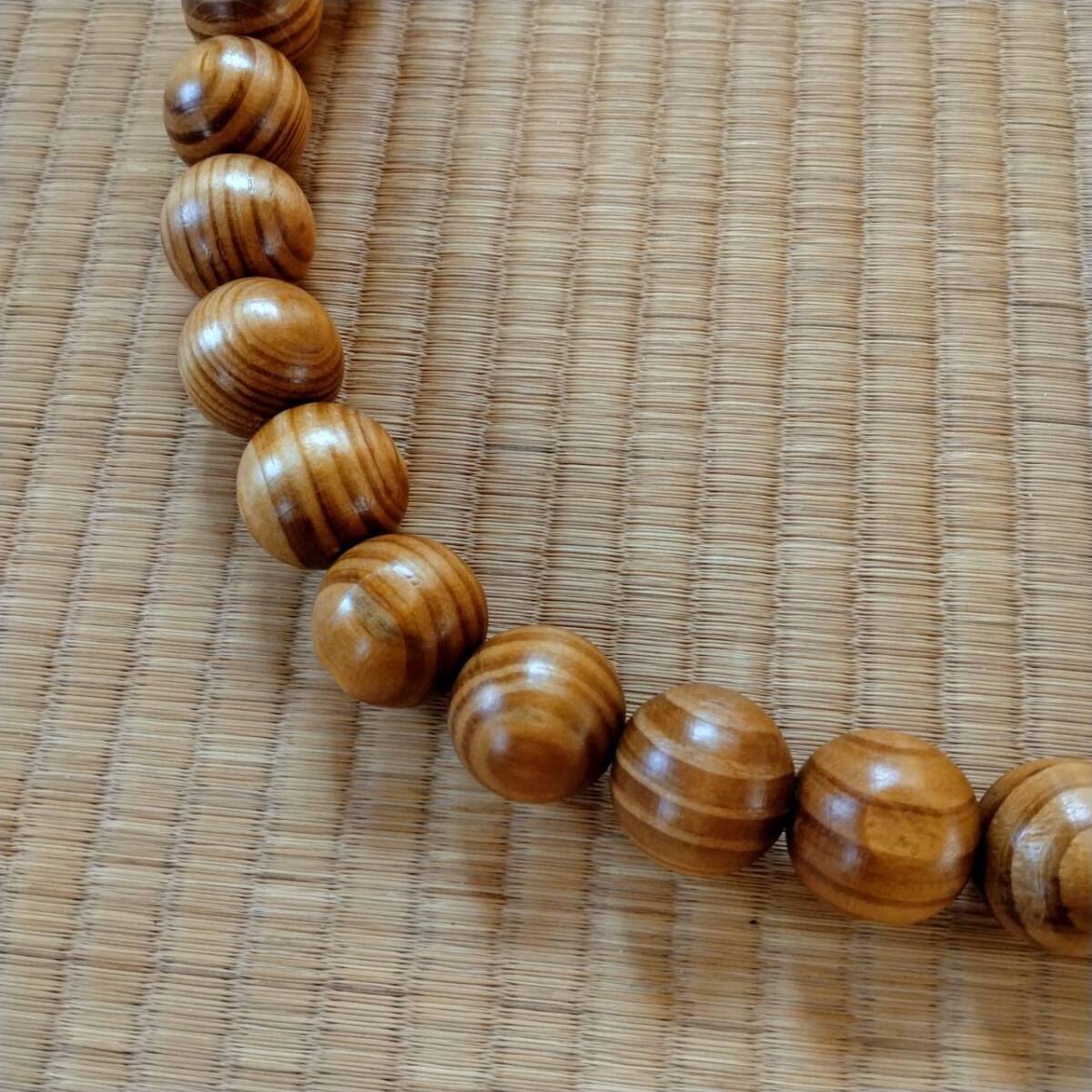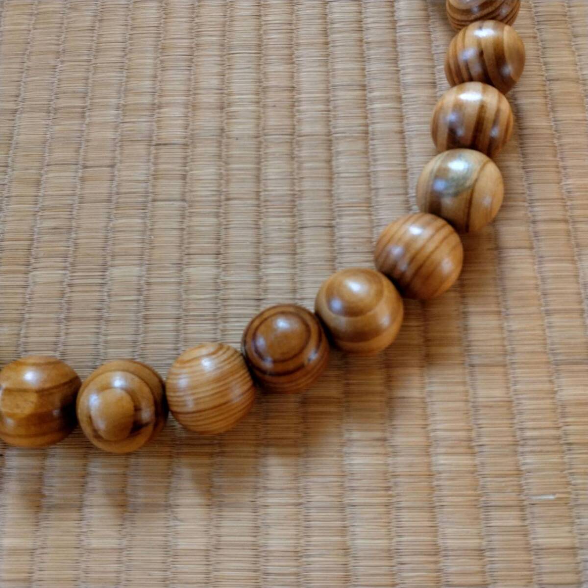 木目の美しい大きな丸い珠で構成され、仏教や瞑想の際に使用されることが多く、宗教的または精神的な意味合いを持っています。