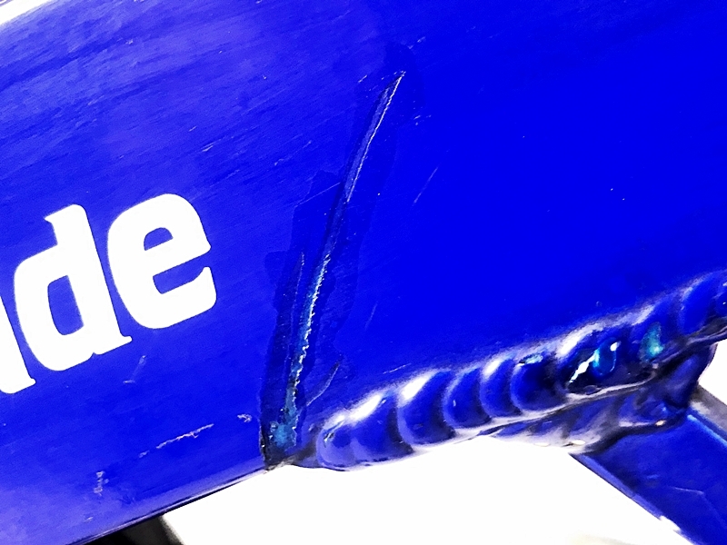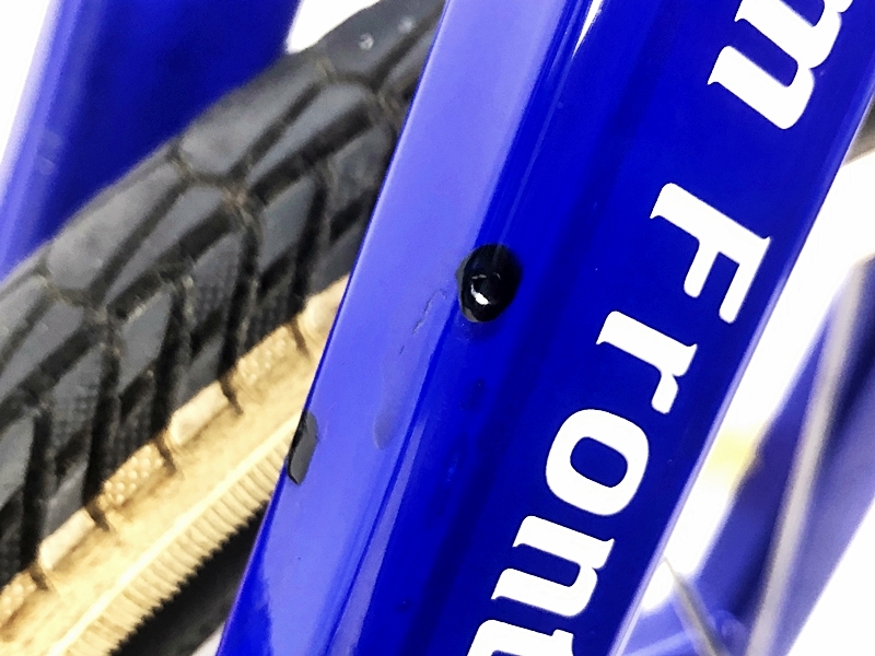 フレーム、その他外観:左フォークに凹み、フレーム各所にタッチペン跡とキズ、落ちない汚れが多数あります。ステムに白サビ、各金属パーツにサビが見られます。
