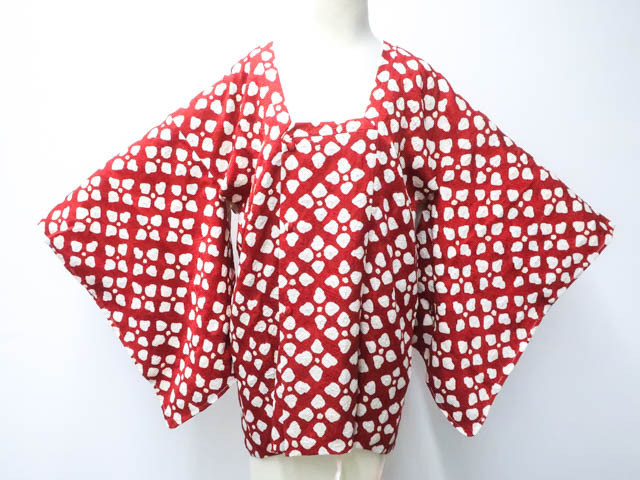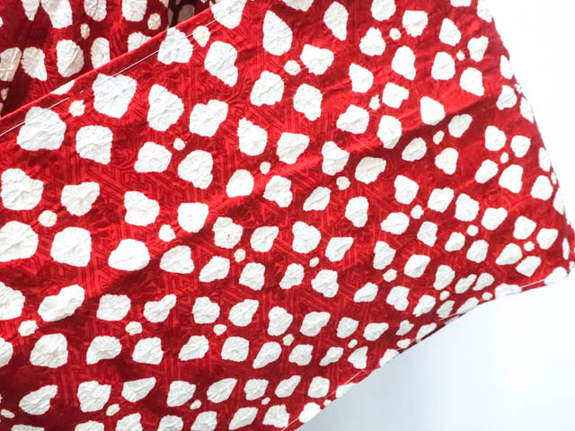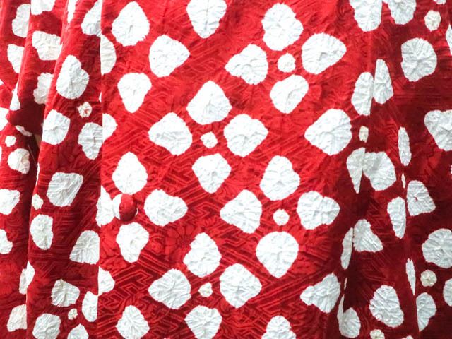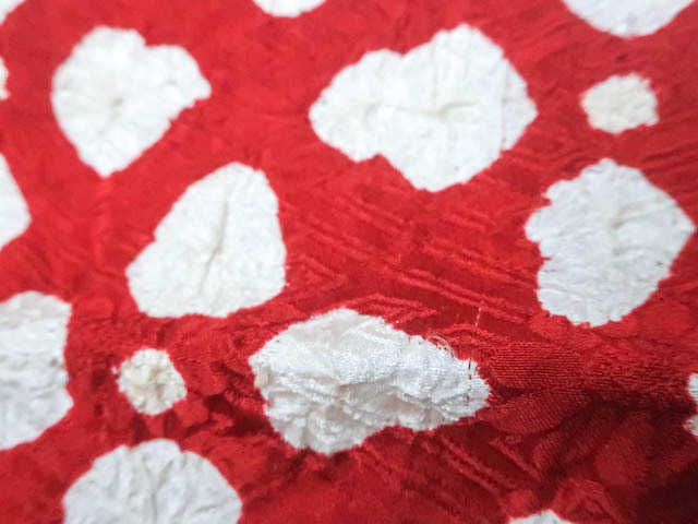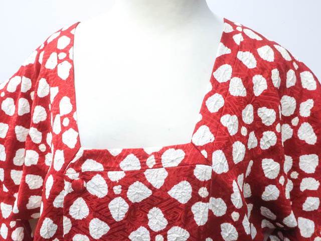 リサイクル商品のため、全体的に絞りにアクがございますが着用可能なお品です。 地色は、赤色です。 1枚目の画像が近いお色かと思われます。 素材は正絹です。 |