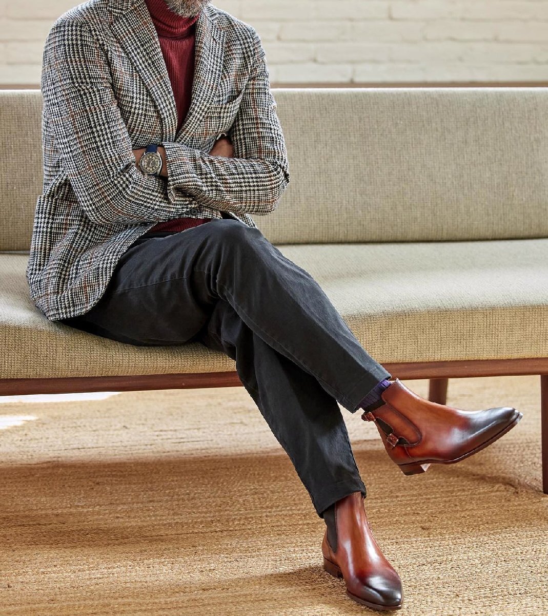 美しいスクエア調のロングノーズフォルムに、サイドに施されたダブルモンクのデザインが洗練されていて、大人の色気もたっぷり。さらに見るからに上質カーフレザーを使用していることがわかる艶やかなアッパーや、熟練した職人のハンドペイントによる芸術的なグラデーションも相まって、非常に美しく洒脱なブーツに仕上がっています。