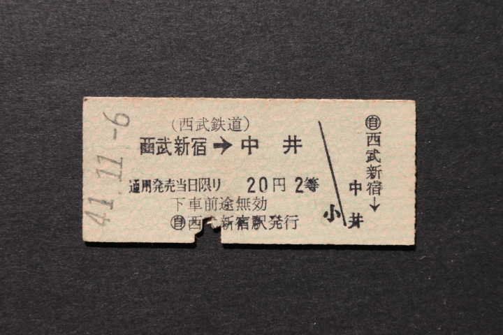 西武鉄道乗車券 西武新宿→中井 20円 2等