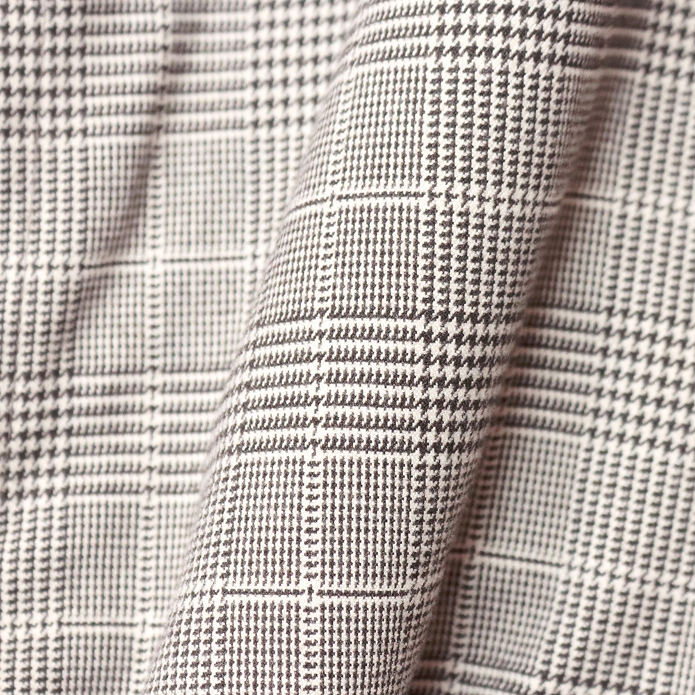 素材は、梳毛ウールのような上品な表情を持つ、ポリエステルレーヨンの先染めチェック。伝統的なグレンチェックを少し崩した「トーンオントーン・チェック」で、ベースカラーに馴染んだ控えめで上品な柄が特徴です。また、染色には水をほとんど使用しない「熱で着色する技術」を採用。環境に配慮したサステナブルな方法で作られた素材を使用しています。