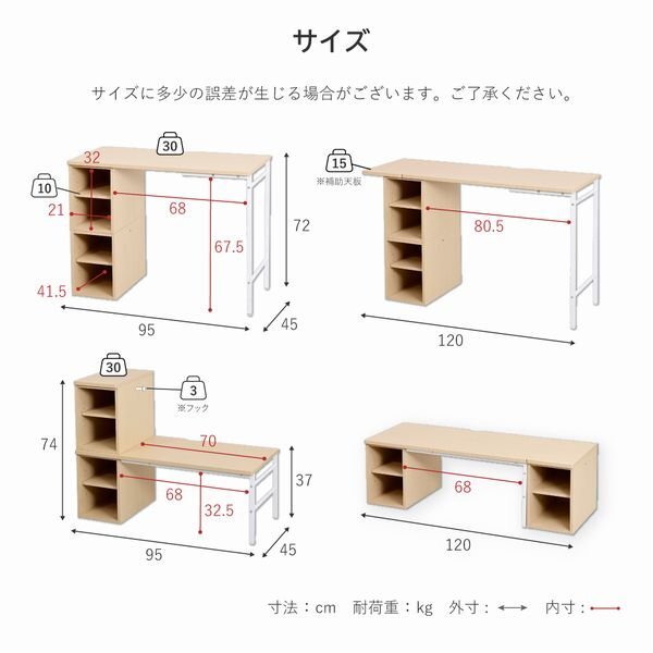 【カラー】 ナチュラル×ホワイト 【サイズ】 <外寸> ハイ:幅95(最大120)×奥行45×高さ72cm ロー:幅95(最大120)×奥行45×高さ74(最小37)cm 補助天板:幅25×奥行45×厚み1.8cm <内寸> ハイデスク天板:幅95(最大120)×奥行45 ハイデスク下:幅68(最大80.5)×高さ67.5cm ローデスク天板:幅70(最大120)×奥行45cm ローデスク下:幅68×高さ32.5cm オープン部:幅21×奥行41.5×高さ32cm 可動棚:幅21×奥行38×厚み1.5cm(3.2cmピッチ5穴) ハイフック:出幅3.5×高さ65cm ローフック:出幅3.5×高さ30(最大67)cm 【材質】 天板・本体:合成樹脂化粧繊維板(メラミン樹脂) 脚:スチール(粉体塗装) 【耐荷重】 デスク天板:(約)30kg以下 補助天板:(約)15kg以下 ラック天板:(約)30kg以下 可動棚:各(約)10kg以下 フック:(約)3kg以下 【生産国】 中国 【梱包】 サイズ:99.5×51×9.5cm、重量:21.5kg 【その他】 ・可動棚2枚 ・補助天板1枚 ・フック2個 ・背面化粧有り 【組み立て品】 お客様による組み立てが必要です。 【ご注意】 ・サイズ、重量は概算です。 ・商品カラーはご使用のモニターによって実際の明るさや色と異なって見える場合がございます。 |