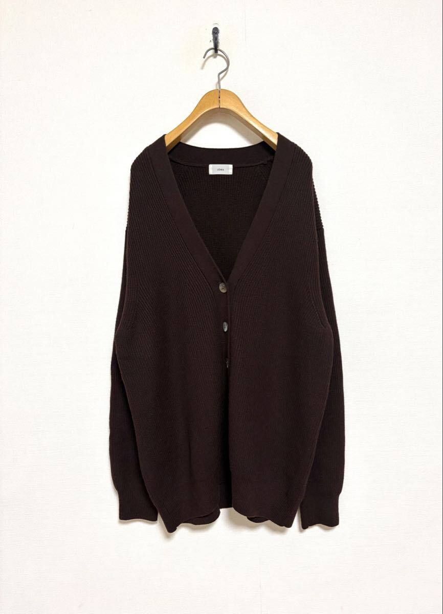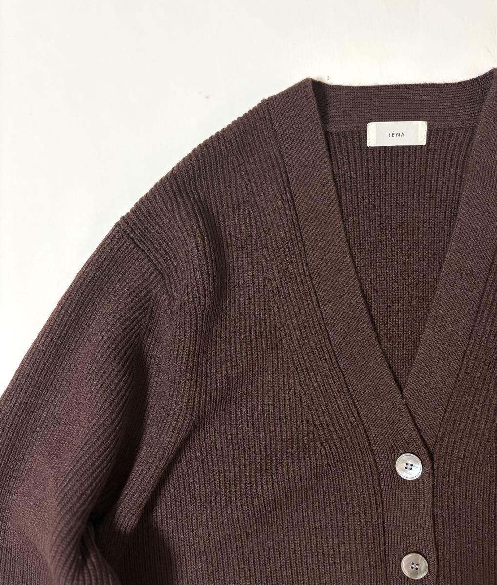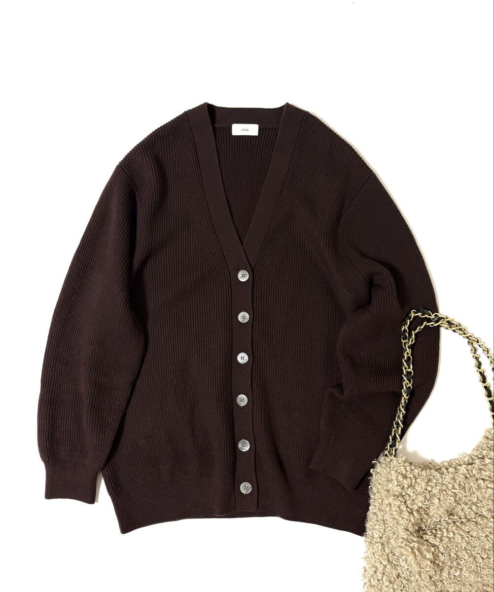 「イエナ」のニット、カーディガンです。サイズ・・・フリー(身幅約56cm、着丈約72cm)。素材・・・ウール90%、ポリエステル10%。カラー・・・こげ茶。定価・・・22000円。細くしなやかなふくらみのあるウールとポリエステルの畦編みのカーディガンです。ポリエステルが入っているのでウール100%よりも軽い着心地です。体のラインを拾わないボックスシルエットで、インナーやボトムを選ばず着回しが利きます。数年前に購入し、何度か使用しました。多少毛羽たちがありますが、目立つダメージはないです。ただ、あくまでユーズドですので、神経質な方はご遠慮ください。よろしくお願いいたします。