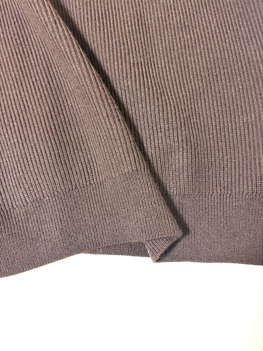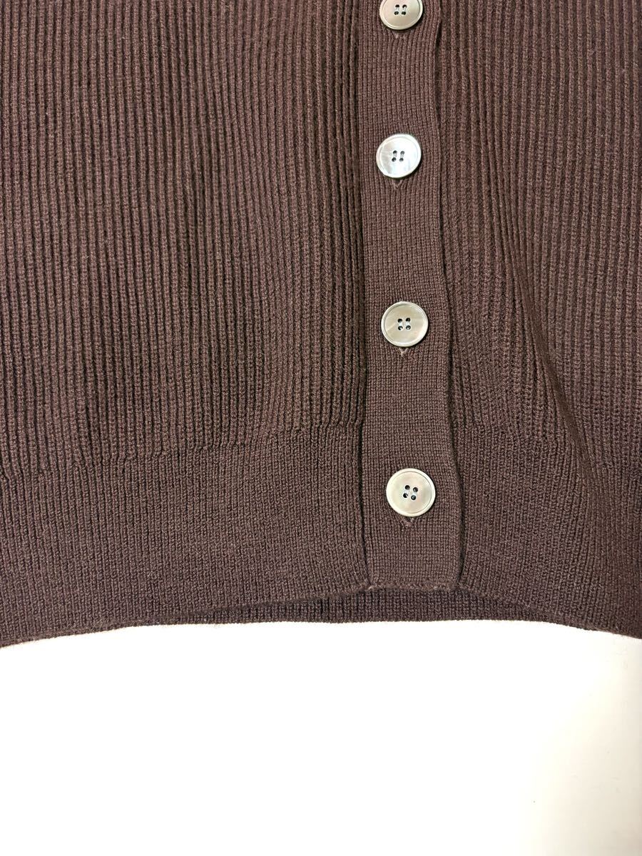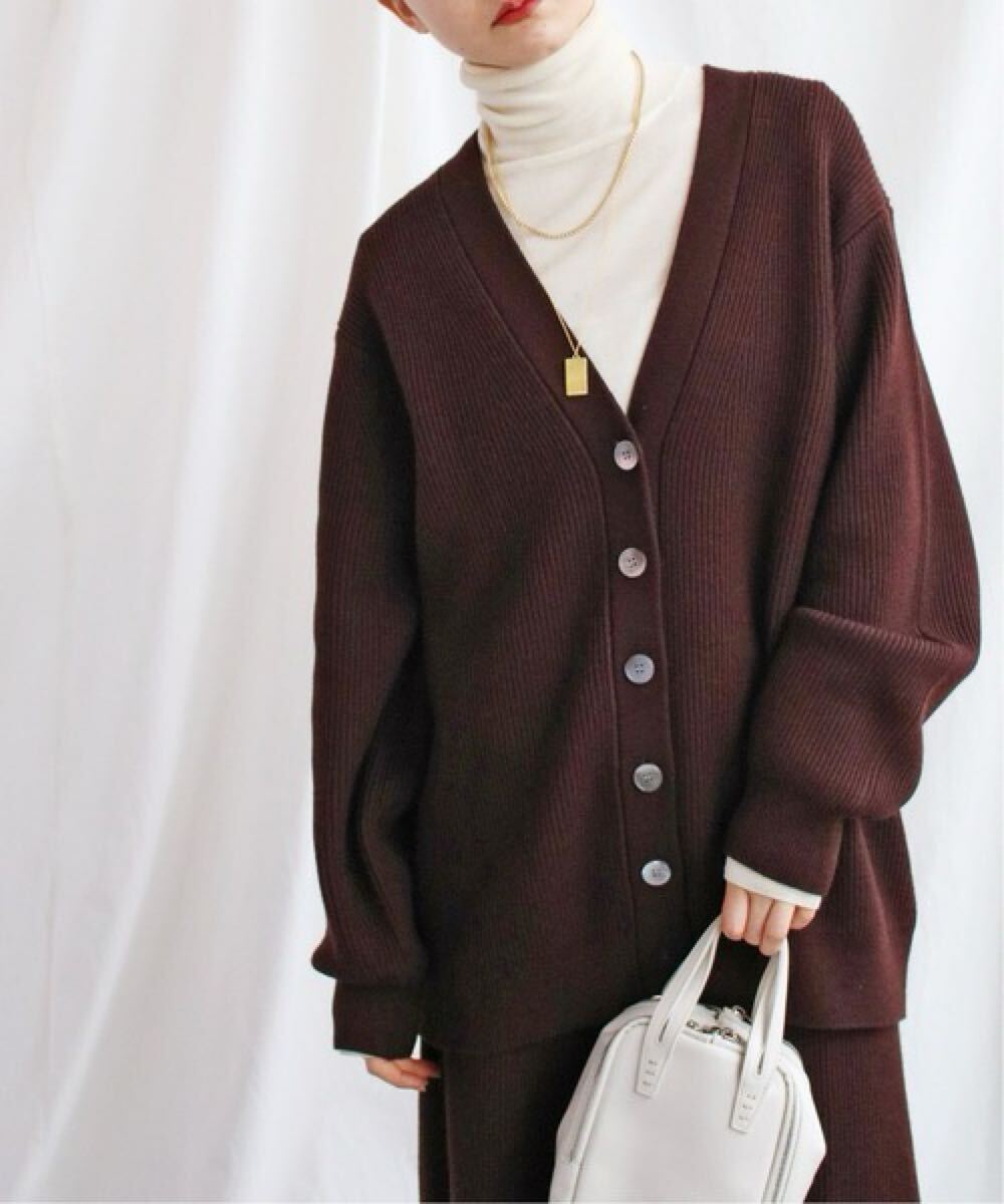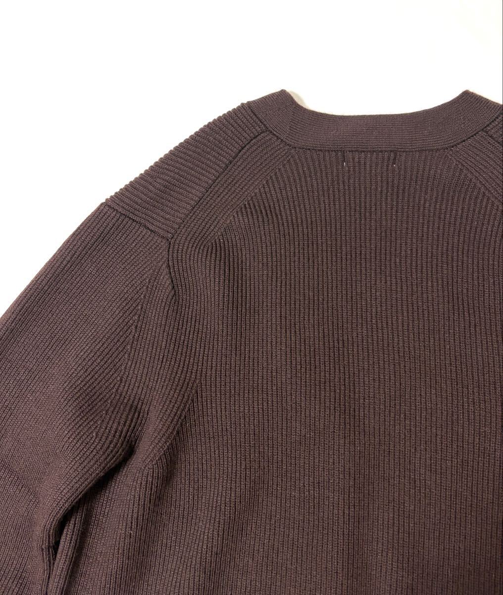 「イエナ」のニット、カーディガンです。サイズ・・・フリー(身幅約56cm、着丈約72cm)。素材・・・ウール90%、ポリエステル10%。カラー・・・こげ茶。定価・・・22000円。細くしなやかなふくらみのあるウールとポリエステルの畦編みのカーディガンです。ポリエステルが入っているのでウール100%よりも軽い着心地です。体のラインを拾わないボックスシルエットで、インナーやボトムを選ばず着回しが利きます。数年前に購入し、何度か使用しました。多少毛羽たちがありますが、目立つダメージはないです。ただ、あくまでユーズドですので、神経質な方はご遠慮ください。よろしくお願いいたします。