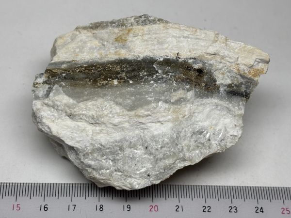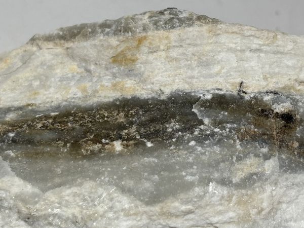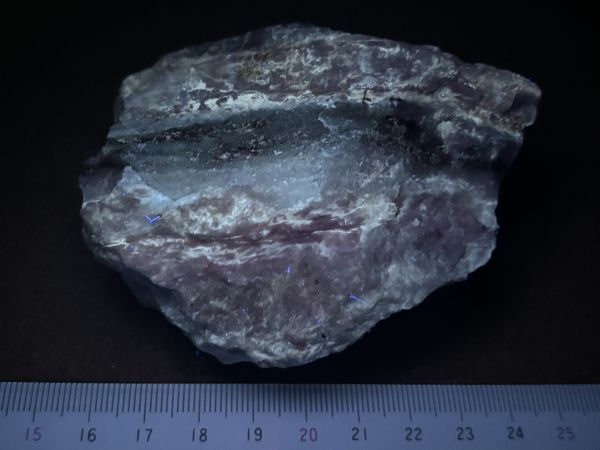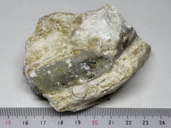 黒部市宇奈月町下立黒部川の転石層状スカルンです方解石、珪灰石を主体としており、層状に生成しております。また紫外線で白系統の蛍光を示します。