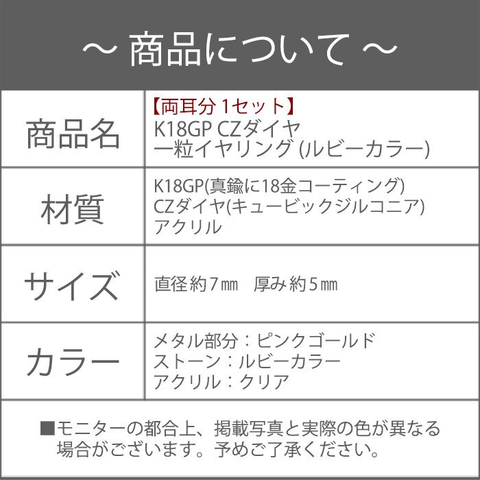 新品/イヤリング/K18GP/レディース/ルビー/カラー/一粒/ダイヤ/CZ/18金/18kコーティング/ピンクゴールド/小ぶり/樹脂/金属アレルギー