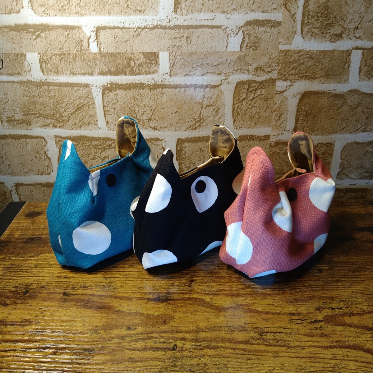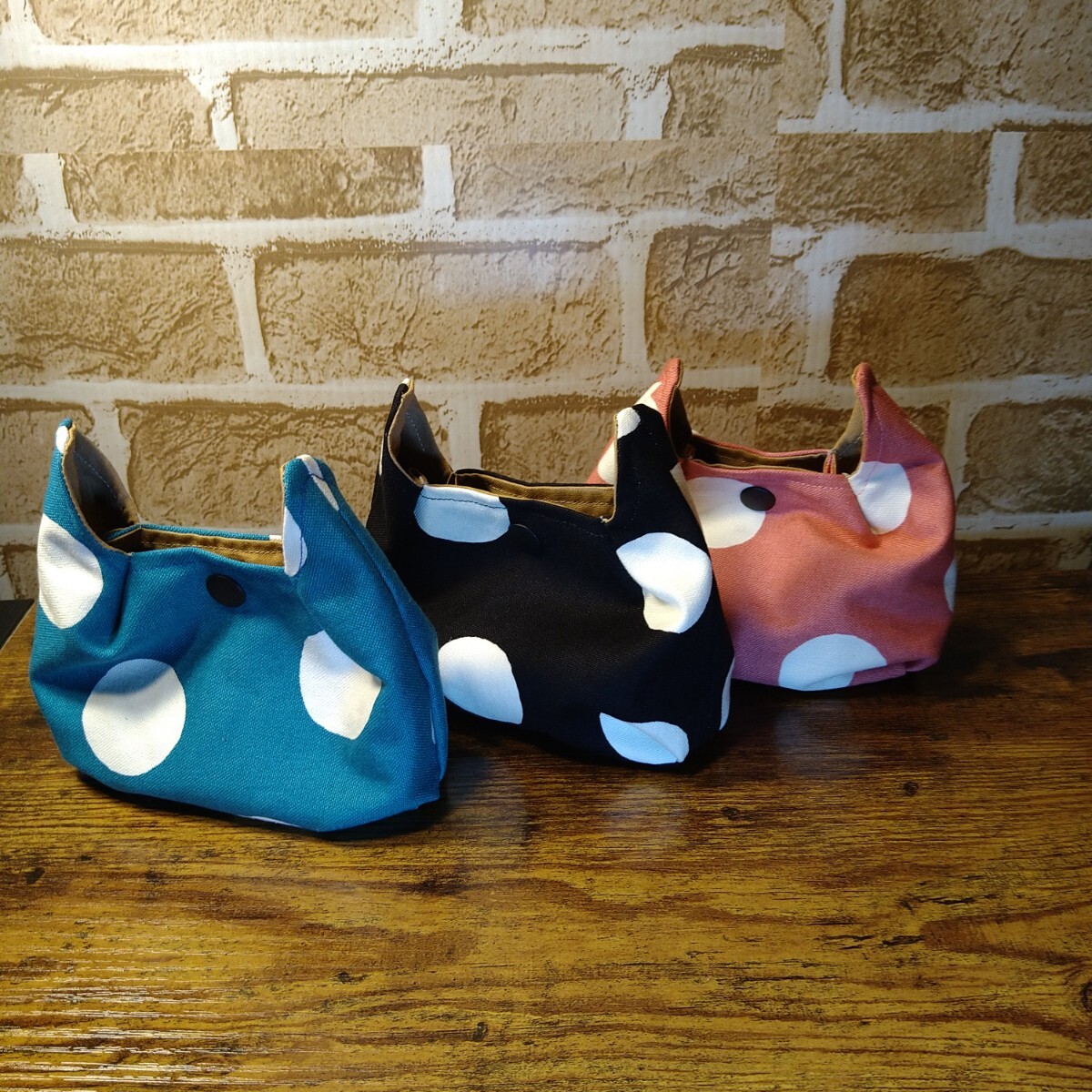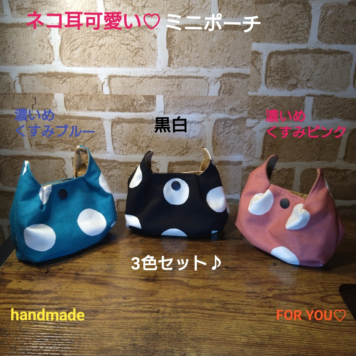 ネコ耳可愛い ミニポーチ 3色セット 11号帆布生地 大きめ水玉柄 濃いめくすみブルー 黒白 濃いめくすみピンク