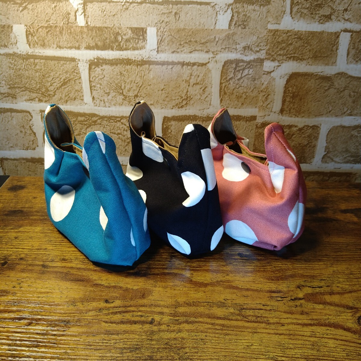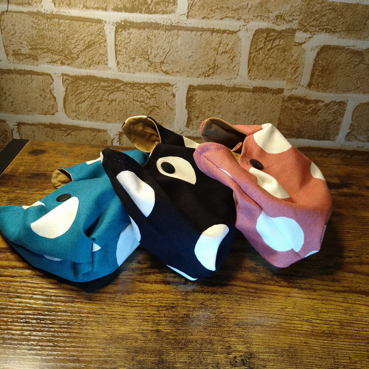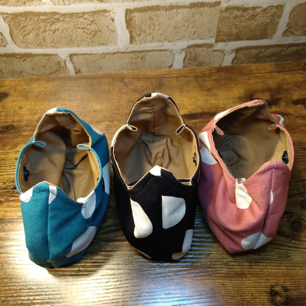ネコ耳可愛い ミニポーチ 3色セット 11号帆布生地 大きめ水玉柄 濃いめくすみブルー 黒白 濃いめくすみピンク