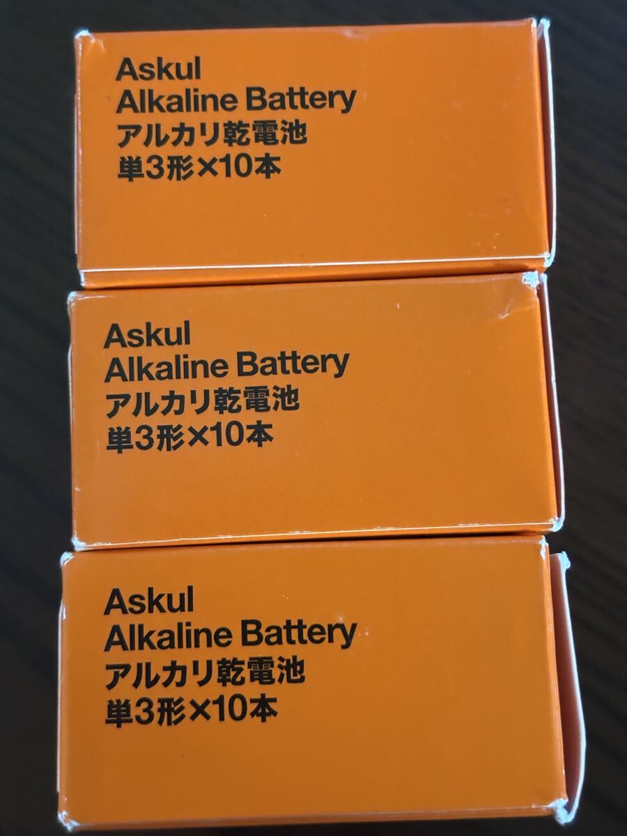Askulのアルカリ乾電池、単3形10本入りが3個セットです。合計30本になります。