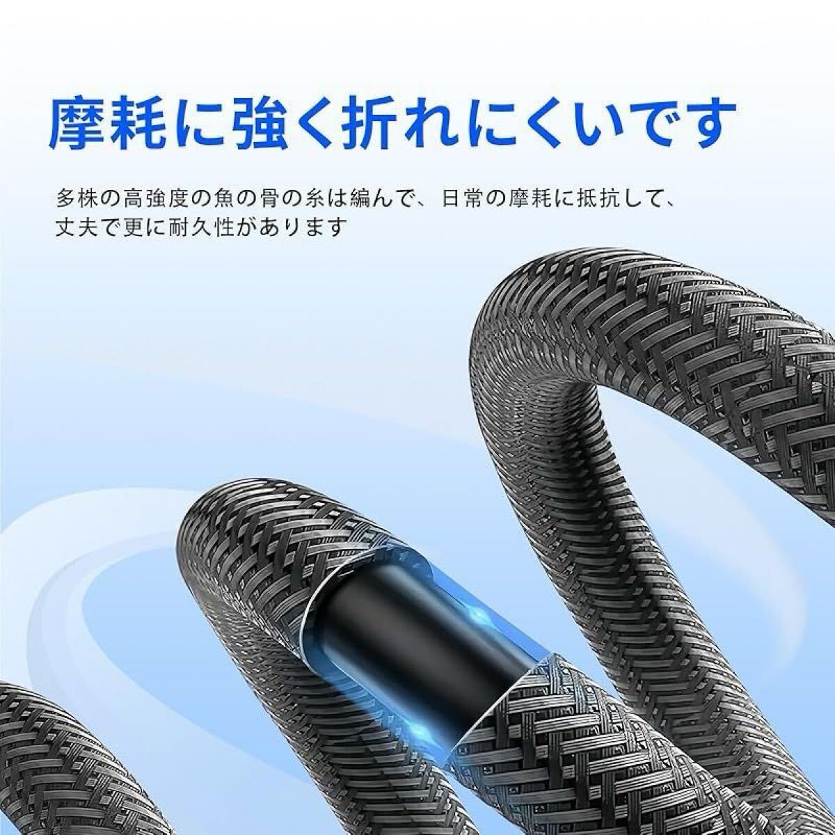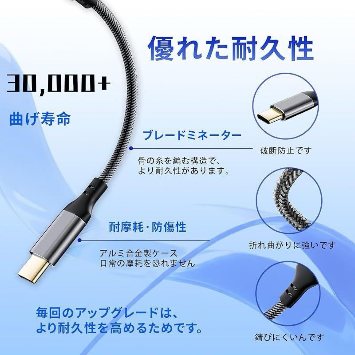 【優れた材料、耐久性】コネクタは頑丈なアルミニウム合金で作られ、ワイヤ本体は高強度TPE材料を採用し、ワイヤコアは純銅材質を採用し、硬化塗装面を塗布し、騒音を効果的に防止することができる。30000回の曲げ試験を経て、優れた耐久性があり、はがれや破断を防ぐことができます。