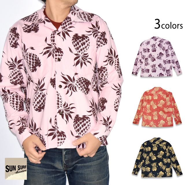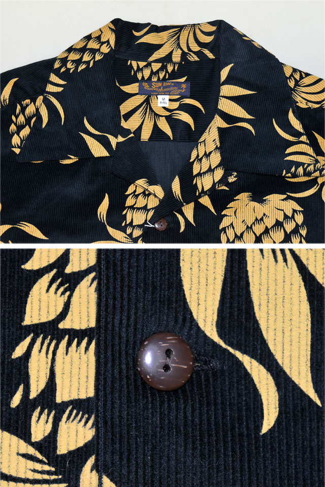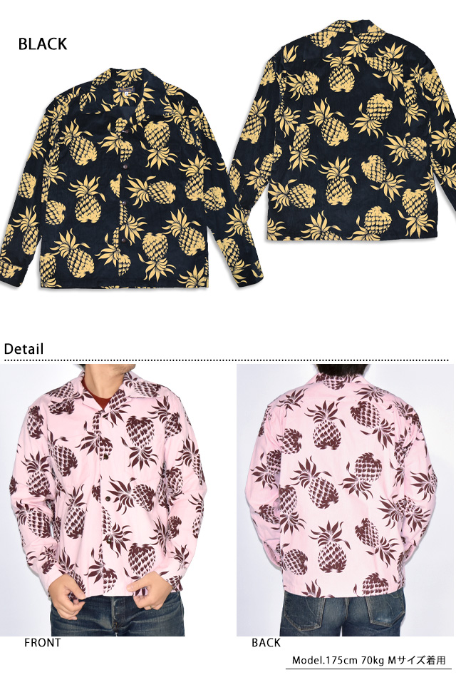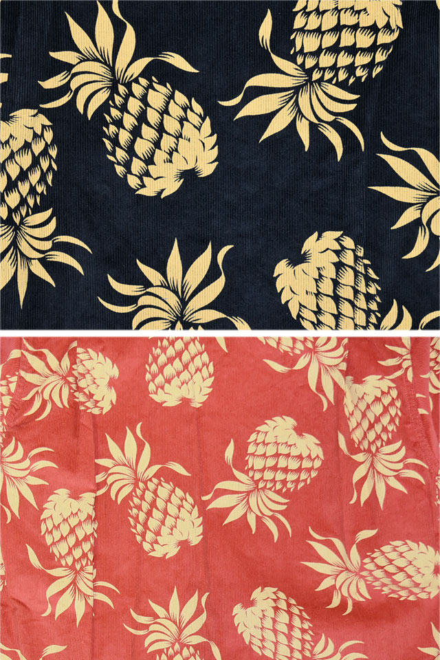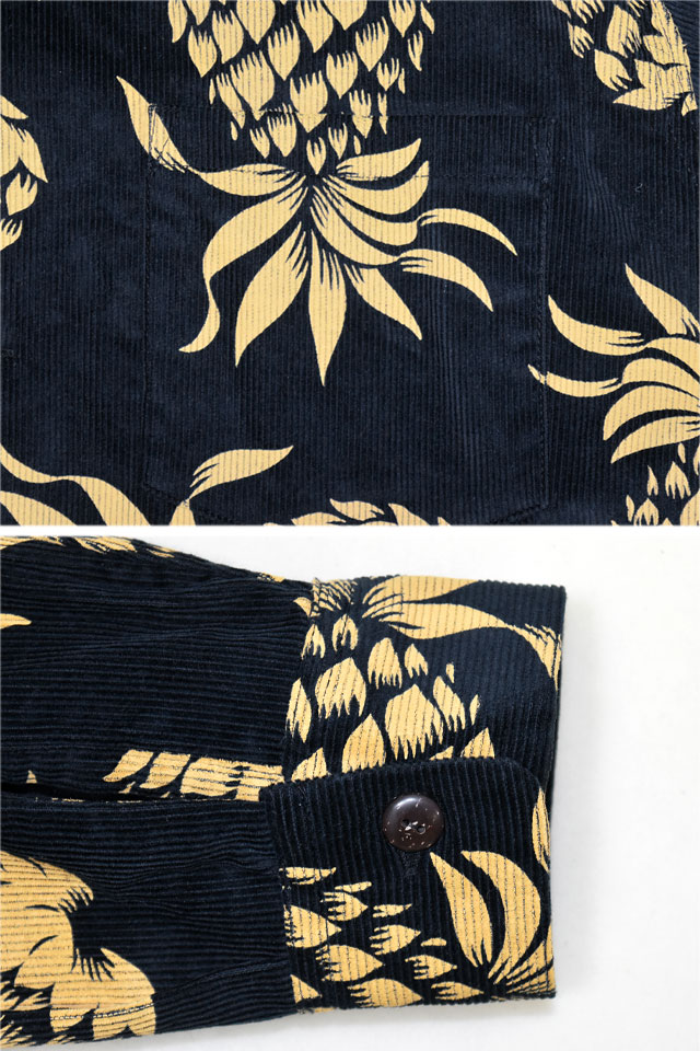 アロハシャツの黄金時代とされる1930~50年代にかけて作られた「ヴィンテージ」と呼ばれる貴重なアロハシャツを再現し、現代に蘇らせているブランド「SUN SURF」から「DUKE'S PINEAPPLE」コーデュロイ長袖オープンシャツ(SS29580)のご紹介です。 1950年代に作られたデューク・カハナモクのヴィンテージアロハシャツのなかでも 代表的なデザインである「デュークス・パイナップル」をコットンコーデュロイ素材で復刻しました。 柄は油性のラバープリントで落とし込まれており、ヴィンテージとは異なる経年変化をお楽しみいただくことが出来ます。 ボディーには、しっかりとした肉厚なコーデュロイ生地を採用。 | ||||||||||||||||||||||||||||||