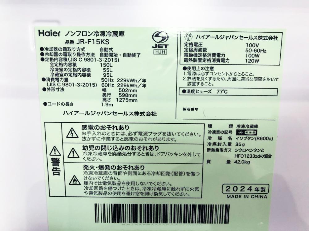 ★引き取りの大歓迎!! ご本人様が直接引取の場合、2,000円値引きます!! 是非お越しください♪ ★お取り置きOK!★ 3ヶ月間までは、無料でお取り置きできます! もしそれ以上の期間をご希望の方は、事前にご相談ください♪ 送料無料★2024年製★極上超美品 中古★Haier 150L まとめ買いに便利な55L大容量ボトムフリーザー! 2ドア冷蔵庫【JR-F15KS】FR1J ※棚・ポケットなど、写真に写しているものが全てです。 ◆動作確認は、しっかり長時間(2~3日間)行っており、冷えも良好で問題ございません。 ◆他に多数出品しており掲載写真をご覧いただければわかりますが、 細かすぎるかもしれませんが、私が気が付いたキズ等に関して、できる限りアップ写真を掲載しております。 こちらの商品に関しては、私が見る限りで申し訳ございませんが、傷や汚れ等なく、全体的にはとても綺麗で、極上超美品だと思います。 ※但し、中古品の為、私の気づかないキズ・汚れ等あるかもしれませんので、気になる方はご遠慮ください。 是非、ご検討をお願いします。 【商品説明】 ■まとめ買いに便利な55L大容量ボトムフリーザー ■整理しやすく取り出しやすい引き出し式クリアバスケット搭載 ■年間消費電力量229kWh/年の省エネ基準達成率133% ■お手入れ簡単ガラストレイ ■明るく見やすいLED庫内灯 ■電子レンジのおける耐熱100℃トップテーブル メーカー Haier ドア数2 開閉方式アップライト方式 有効内容積150L 上段 冷蔵室容量95L 下段 冷凍室容量55L 製品寸法幅502×奥行598×高さ1275㎜ 製品質量42.0kg 2024年製 詳しくはこちら↓ ◆動作保証しておりますので、商品到着後3日以内に落札後の商品お取引画面から、動作不良等の内容をメッセージ連絡頂きましたら、初期不良対応は致します。但し、電源が入らない、全く稼働しない致命的な不具合に限ります。 ◆簡易清掃を行っております。 当方としては、清掃を行っておりますが、あえて簡易清掃と言わさせていただきます。 神経質な方や、新品同等のレベルをお求めの方、気になる方はご遠慮ください。 ◆その他、素人なりに慎重に確認したつもりですが、中古品の為、私の気づかない傷や汚れ等あるかもしれません。 専門的・神経質な細かな点までの対応はできませんので、基本的にノークレーム・ノーリターンでお願いします。 ※下記内容を最後まで、必ずお読み下さい。 ご入札・落札の際は、ご了承頂いたものとみなします。 注意事項★☆★☆★☆★☆★☆★☆★☆★☆★☆★☆★☆★☆★☆★☆ ●ヤフオクシステム改定に伴い、「 受取連絡 」が非常に重要となりますので、商品到着後24時間以内に受取連絡された方のみ、初期不良対応・保証対象とさせていただきます。 ●私としてで申し訳ございませんが、できる限り誠意ある対応を心がけているつもりですが、顔の見れないお取引が故に色々な方がおり、また人それぞれ感性など異なりますので、ところどころ、あえてと記載させて頂いております。 ●初期不良対応・保証に関して、お届け先へ商品到着後、3日以内が保証対象となります。 ●商品が届いたご住所で動作確認等行ってください。移動しますと保証対象外になります。 ●万が一、商品に不具合等がございましたら、落札商品お取引画面から具体的な不具合等の内容をメッセージして下さい。商品到着後、3日以内メッセージを頂けていない場合は、保証対象外となりますので、必ずお願いいたします。 ●家電に関しては、あえて、電源が入らない・全く稼働しないなどの致命的な不具合、家具類など電気を使わないものは、その物として成り立たない物に限らさせていただきます。 ●動作確認・状態確認が終わるまで、梱包材・運送会社の伝票など必ず保管してください。保管されていない場合、初期不良対応・保証ができなくなる場合がございます。 ●運送事故の恐れがあった場合、所有権がお客様側に移っておりますので、お客様にて運送会社とのご対応をしていただくことになりますが、穏やかなお話合いができる方に関しては、不慣れかと思いますので、こちらもできる限りのご協力をさせていただきます。 ●当方は、運送会社が起こしたトラブル・遅延に関しては、一切の責任を負いません。 ●商品に不具合等あっても、設置代金等、一切の責任を負いません。 ●勝ってな返品物に関しては、一切受け取りません。 ●未チェック品、現状品、ジャンク品、訳あり品として出品しております物は、一切の保証・初期不良対応・返品応対は行いません。また、キャンセルもお受けいたしません。 ●対応前、対応中に一方的に評価されたり、自己完結されたり、決めつけられたり、お話合いにならなかったり、暴言を吐かれたり、モラハラとこちらが感じたり、お電話しても連絡が全く取れない場合等は、一切の対応、保証等を行いませんので、ご了承ください。 ●返金に関して、当方に重大な過失(送られてきた商品が全く違う)を除き、あえて、基本的には落札金額の