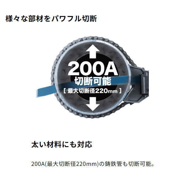 太い材料にも対応 200A(最大切断径220mm)の鋳鉄管も切断可能。