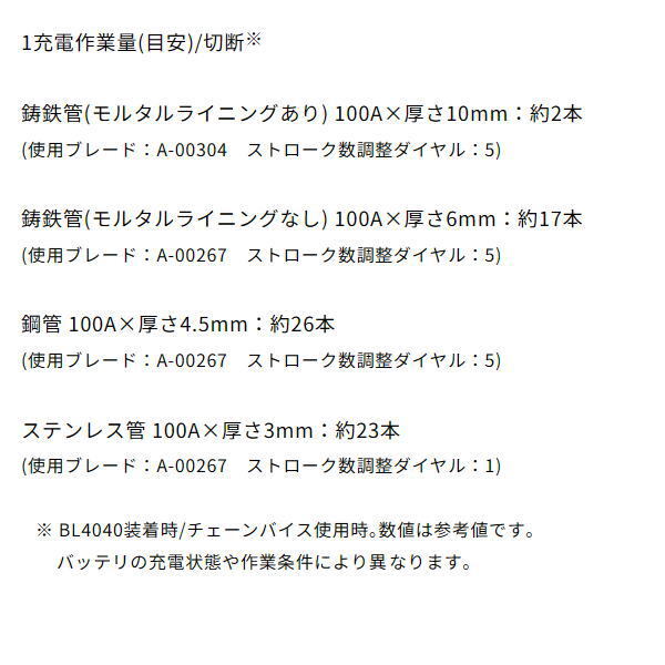 ※モルタルライニング鋳鉄管の切断は別売のダイヤバイス湾曲ブレードが必要です。