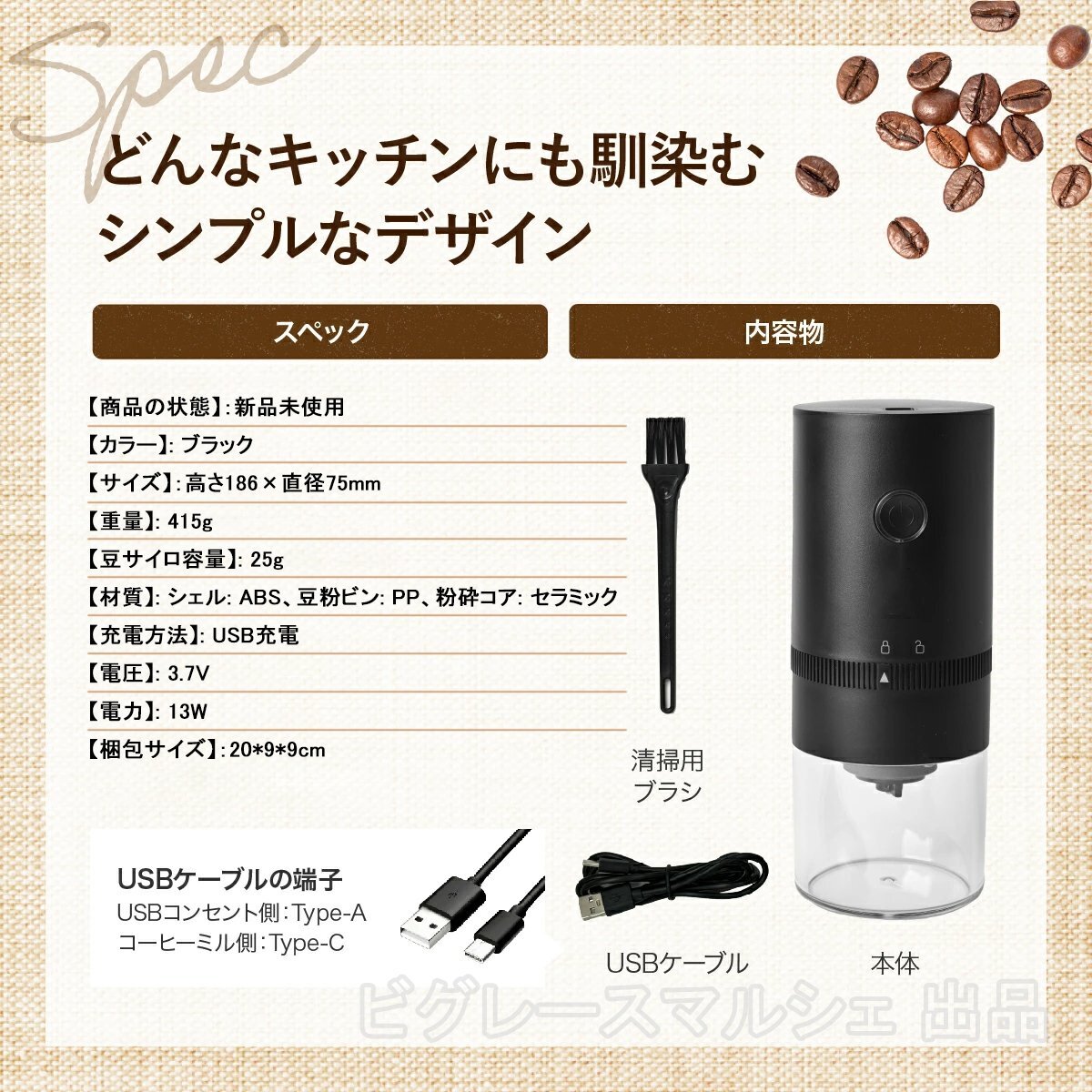 【材質】: シェル: ABS、豆粉ビン: PP、粉砕コア: セラミック