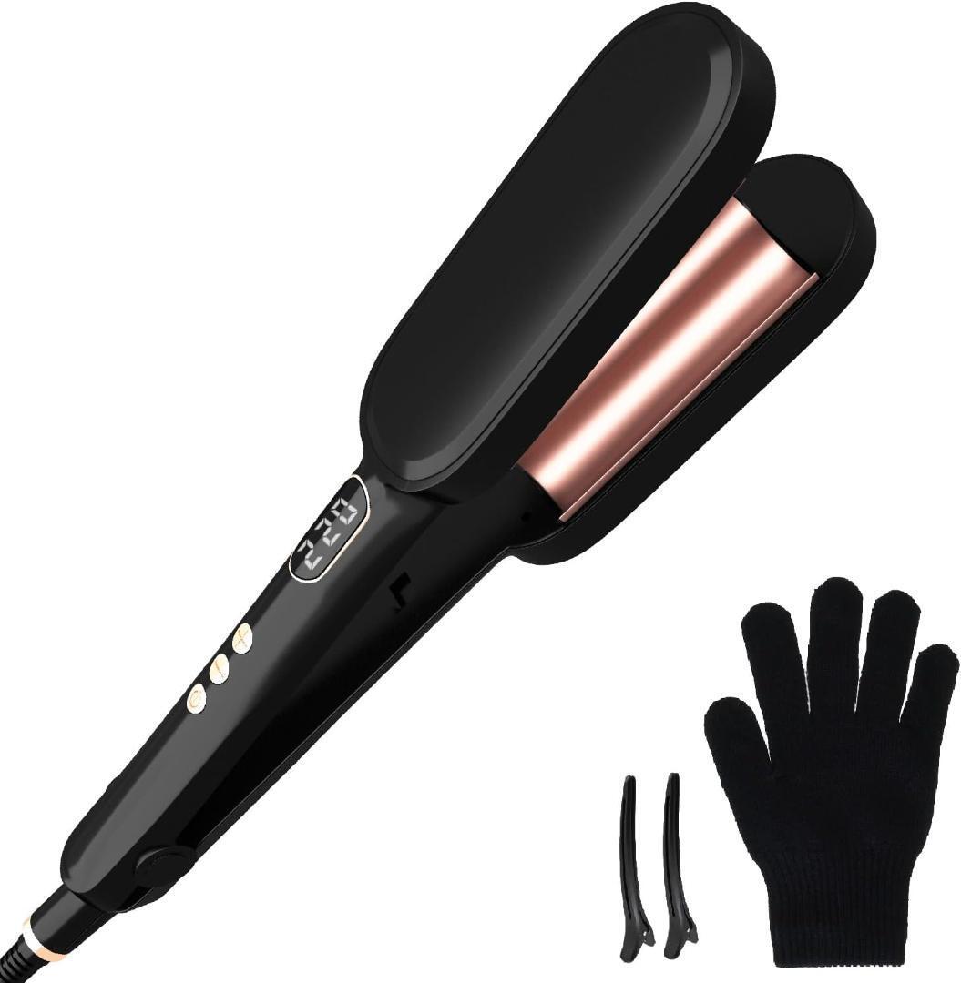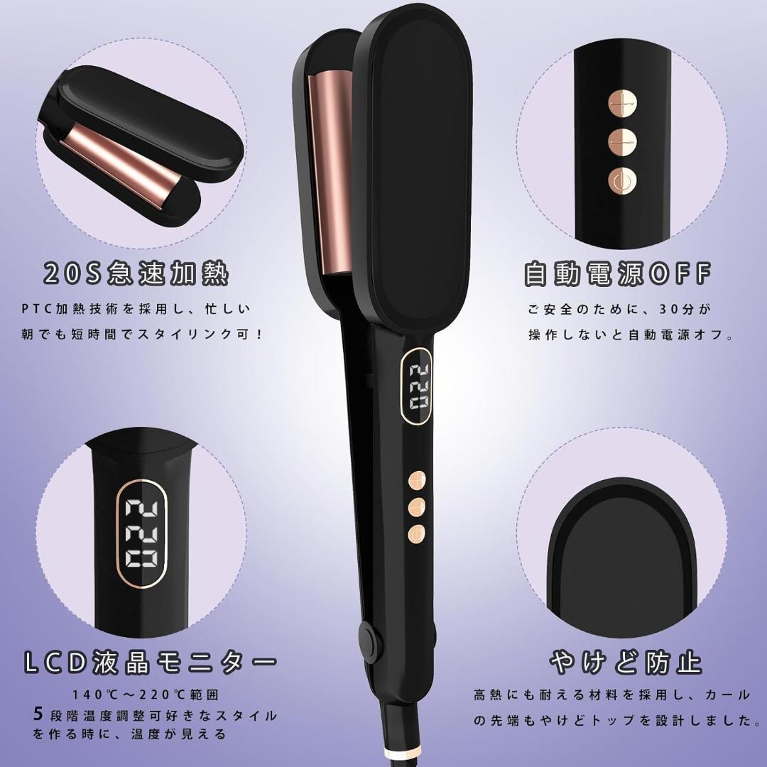 ウェーブアイロン 挟むだけ ヘアアイロン 140℃~220℃ ワッフルアイロン5段階温度調節 やけど防止 千万級マイナスイオン吹出 (ブラック)