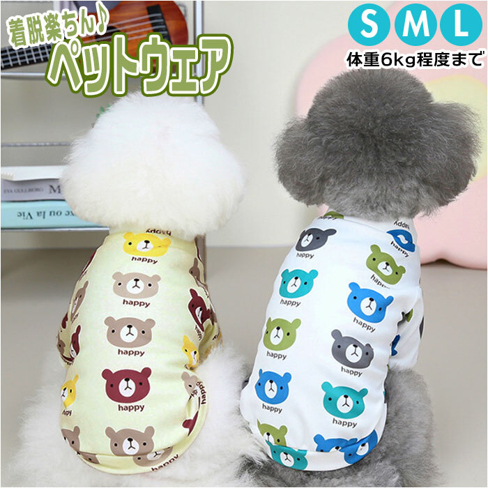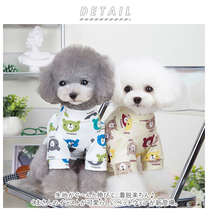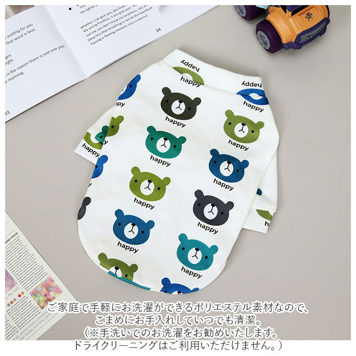 | 商品説明 | ・・生地がぐ~んと伸びて、着脱楽ちん♪くまさんのイラストが可愛らしいペットウェアが新登場。 ・肌触りがツルンと滑らかで、伸縮性抜群の生地がワンちゃんの身体に優しくフィット。ワンちゃんの頭にすっぽりと被せて、前足を通すだけで着せ替えが簡単なプルオーバータイプ。 ・薄手の生地感ながら、裏地にもわずかに起毛させた滑らか素材を使用しているので、保温性もばっちり。まだ肌寒さの気になる春先や秋口のお散歩に最適。 ・トイレの時にお洋服を汚す心配のない、お腹周りが開いたデザインで、室内用ウェアにもオススメ。 ・ご家庭で手軽にお洗濯ができるポリエステル素材なので、こまめにお手入れしていつでも清潔。(※手洗いでのお洗濯をお勧めいたします。ドライクリーニングはご利用いただけません。) ・SサイズからLサイズまでの3つのサイズから、ぴったりサイズがチョイス可能!超小型犬から、体重6kg程度までの小型のワンちゃんに最適なサイズ感。小さなサイズはネコちゃんにも。 ・ワンちゃんがオシャレに着こなせるハイネックスタイルに、カラフルなくまさんフェイスがデザインのアクセント。 |