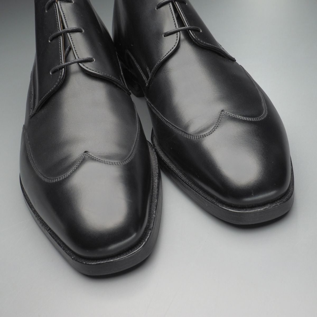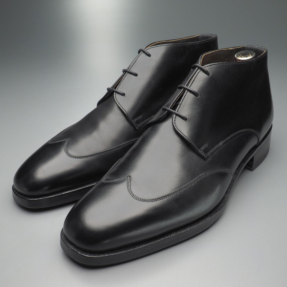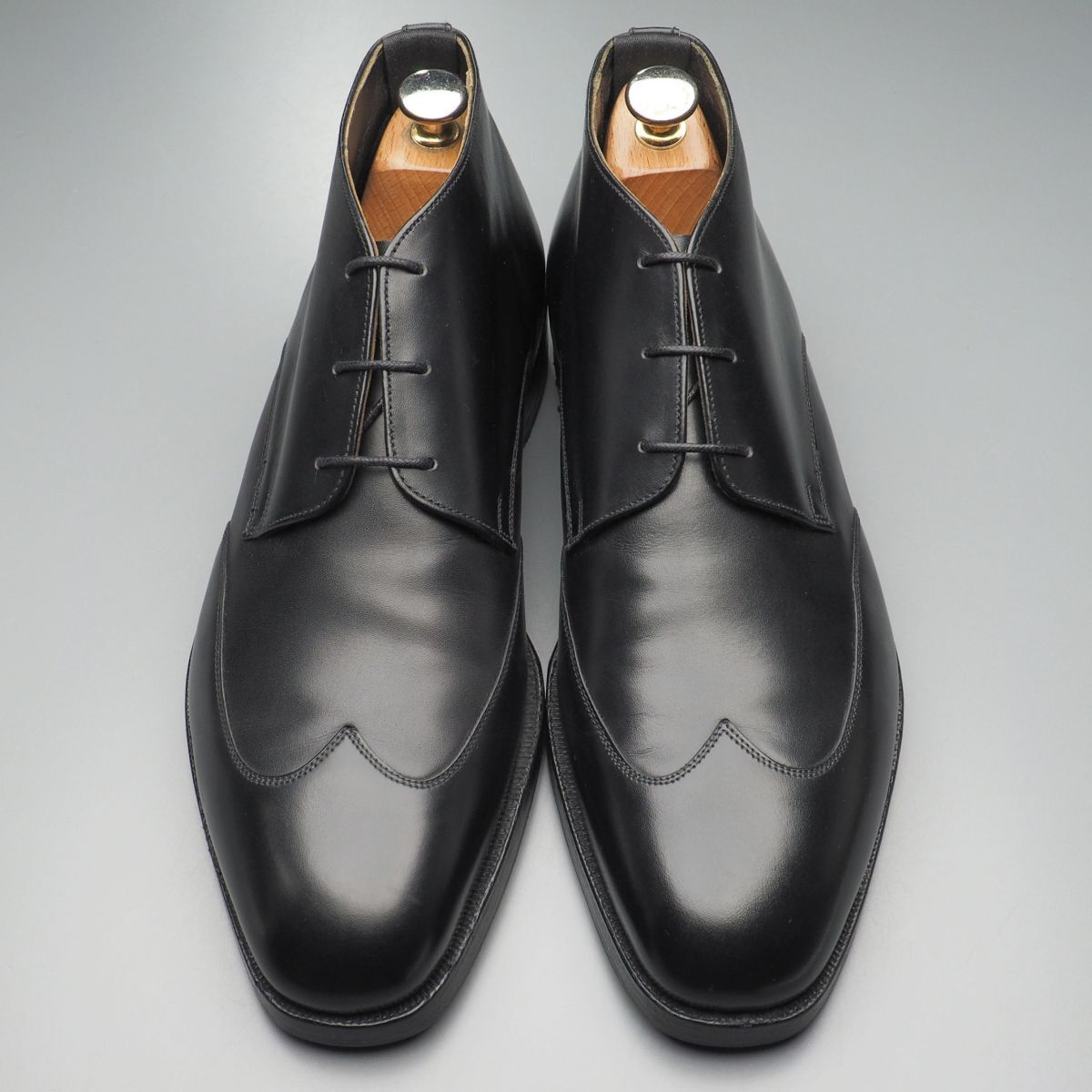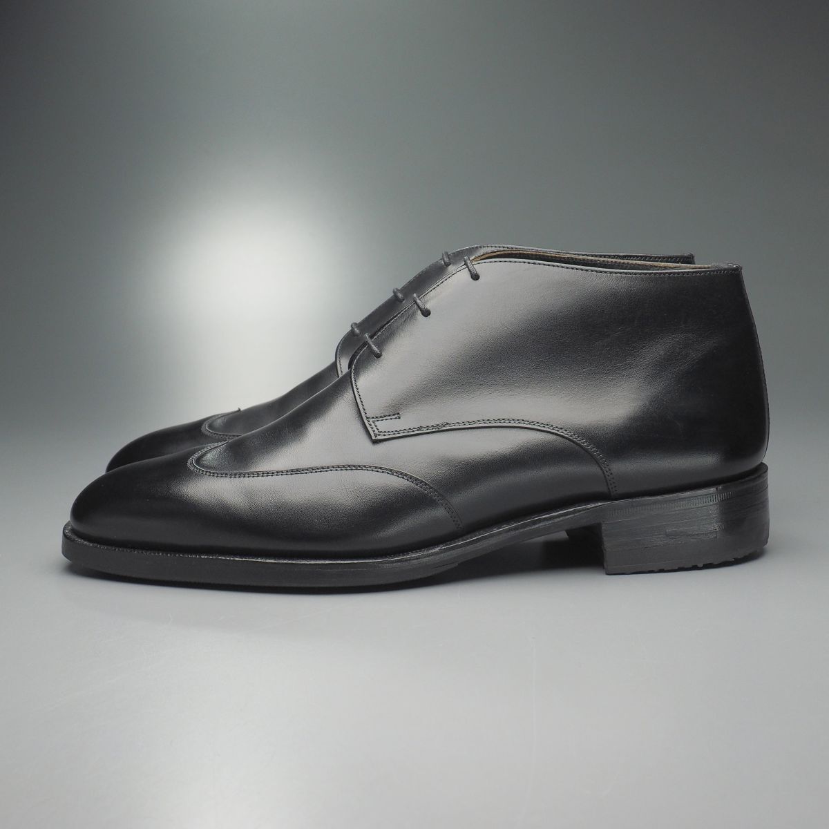 1886年創業、英国を代表する老舗シューメーカー「グレンソン/GRENSON」の一足。 同ブランド最高峰のグレードに位置付けられるマスターピースコレクションのチャッカブーツ。 きめ細かく柔軟性のある黒のスムース革をアッパーに用いたブラインドブローグ仕立ての3アイレットチャッカ。 ラバーの半張りが施されておりますが、アウトソールはヒドゥンチャネル仕上げ、またライニングには小窓を配すなど小粋なディテールが光ります。 製法:グッドイヤーウェルテッド アウトソール:レザー×ラバー トップリフト:ラバー ライニング:レザー 生産:イングランド製 ※撮影用のシューキーパーは付属致しません。 ※本物の商品ですのでご安心の上オークションをお楽しみ下さい。 ※タイトル頭の英数字は弊社の管理番号です。 ※ほかにも多数の商品を出品しています。 ※同梱に関しましては「まとめて取引」でのみ対応可能です、その他の方法での同梱対応は出来かねます。 (※商品の特性上、同梱対応出来ない商品もございますので予めご了承下さい。) |