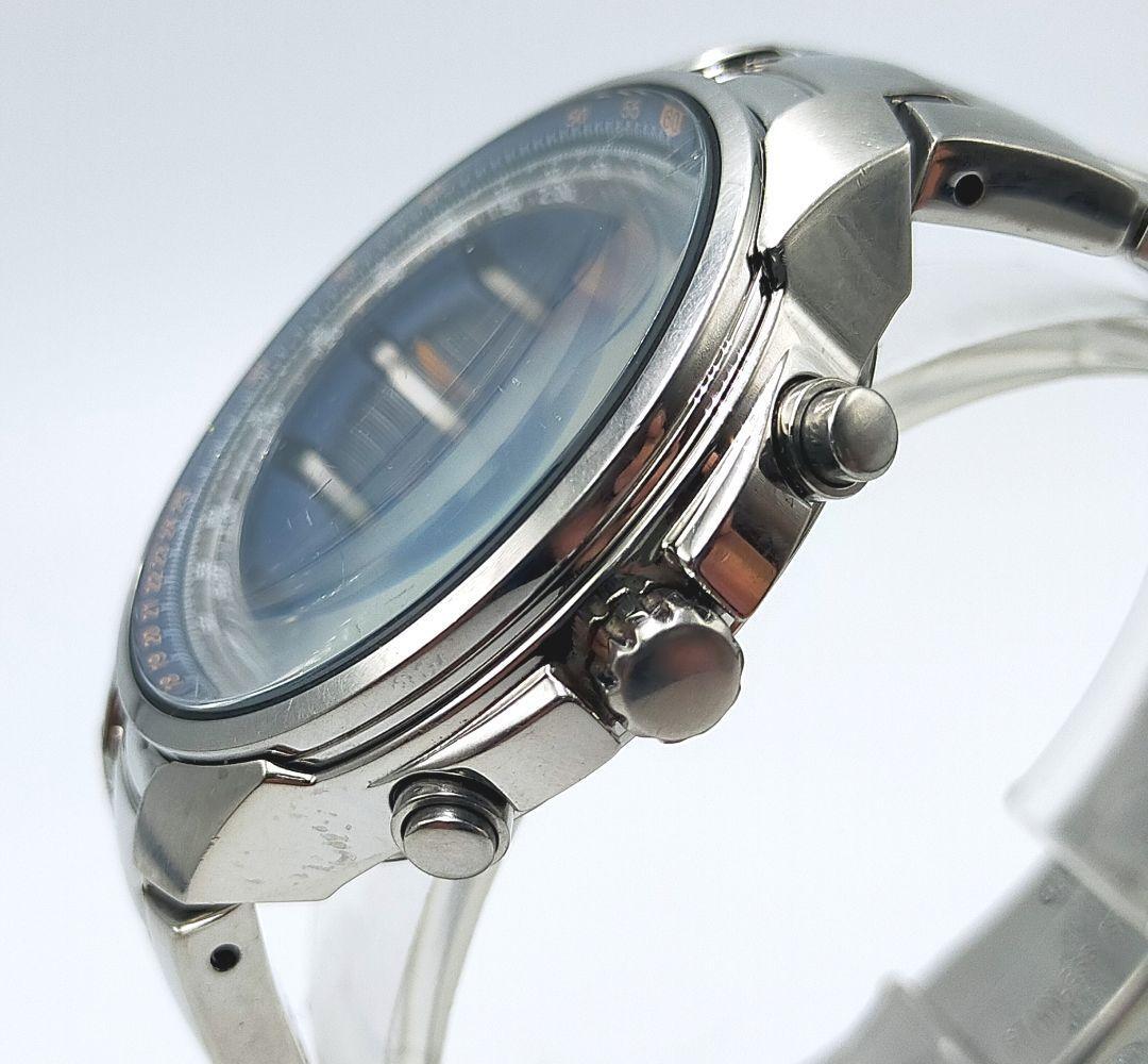 鮮やかなブルーの文字盤に、オレンジの針が映えるセイコーのパイロットクロノグラフです。 航空計算尺を備えたメカニカルなデザインは、男心をくすぐる希少な一本。ビジネスシーンでは知的な印象を、カジュアルな装いにはスポーティなアクセントを加えてくれます。