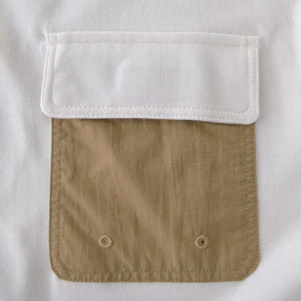 シンプルな中にさりげないアクセントを効かせた、布帛ポケット付き長袖Tシャツ。 胸元のポケットは実用性だけでなく、デザインのポイントとしても存在感を放ち、コーディネートに程よい遊び心をプラスしてくれます。 ゆったりとしたシルエットでリラックス感があり、裾にはドローコード付きで、シルエットの変化もお楽しみ頂けます。 デイリーウェアとしてはもちろん、アウトドアやレジャーシーンにもぴったりのアイテムです。 生地にはリサイクル天竺を使用。 柔らかく快適な肌触りと優れた通気性を兼ね備えており、長時間の着用でも快適さが続きます。 環境に配慮した素材を選ぶことで、サステナブルなライフスタイルをさりげなく後押ししてくれる一枚です。 |