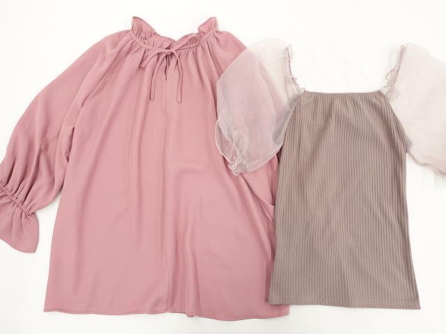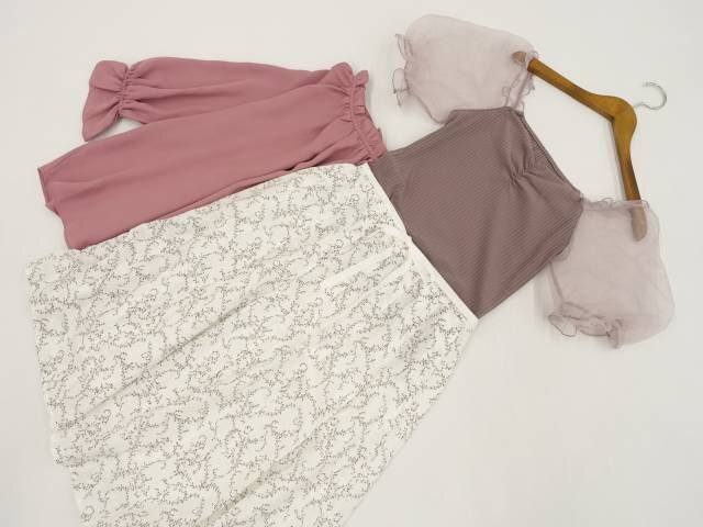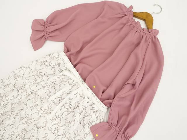 洗える五分袖シフォンカットソー+九分袖プルオーバーブラウス+ひざ丈タックスカート コーディネート上下3点セット L相当 ピンク系/ホワイト地 ブラウン ボタニカル柄 ガーリー・フェミニン系 20代・30代