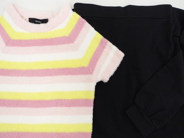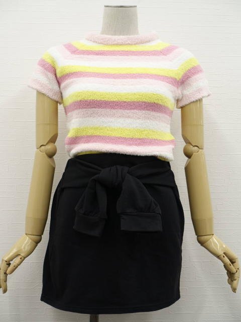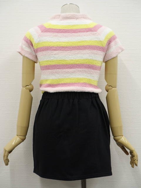 洗える半袖 ニットセーター+ミニ丈 台形スカート コーディネート上下2点セット M相当 ピンク×ホワイト×イエロー ボーダー柄/ブラック カジュアル系 20代