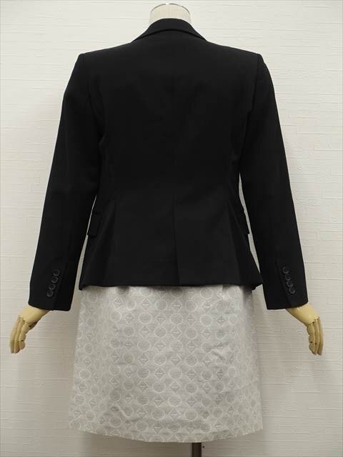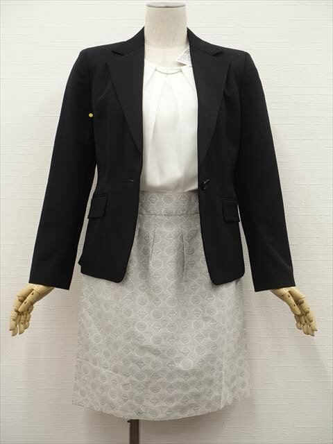 長袖テーラードジャケット+ノースリーブプルオーバーブラウス+ひざ丈タックスカート コーディネート上下3点セット S相当 ブラック/ホワイト/シルバー 総柄 きれいめ・シンプル系 20代~30代