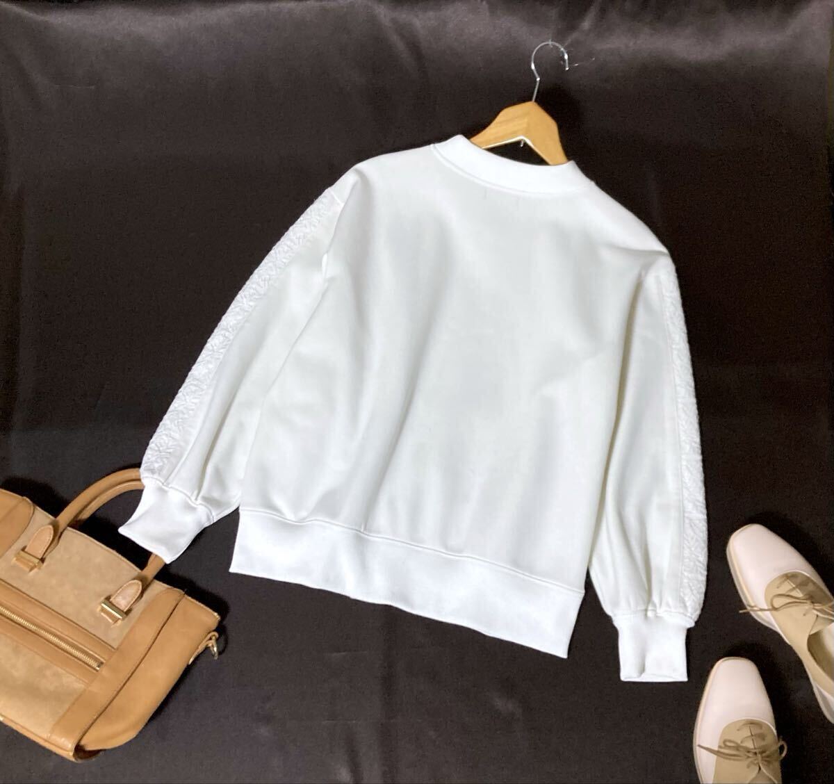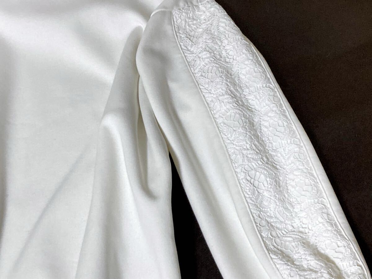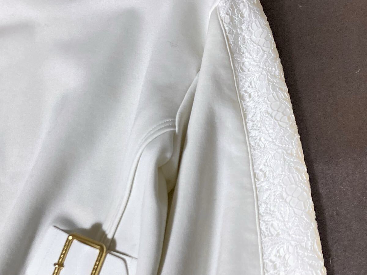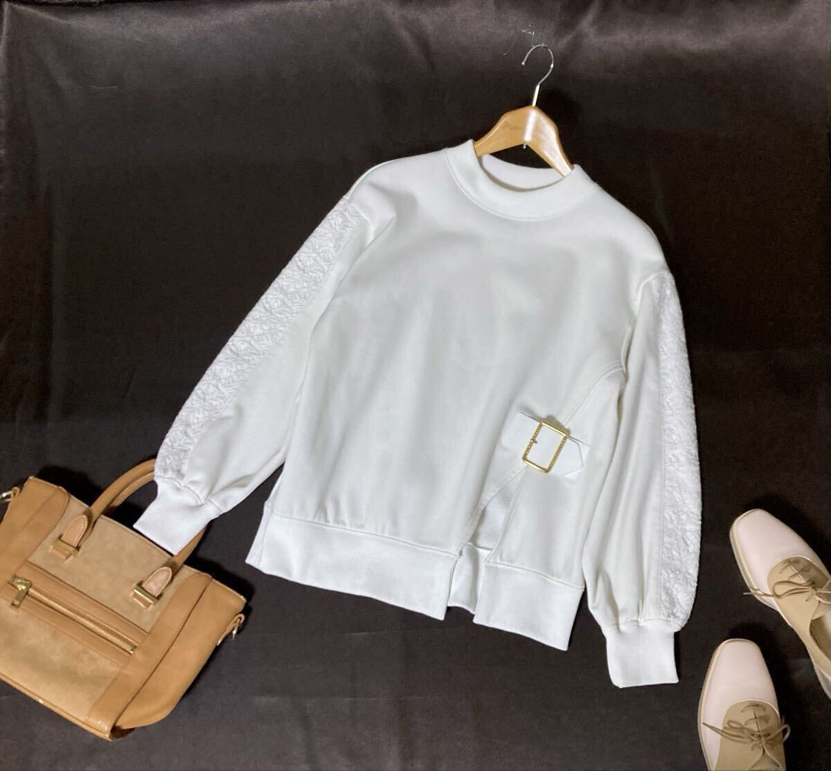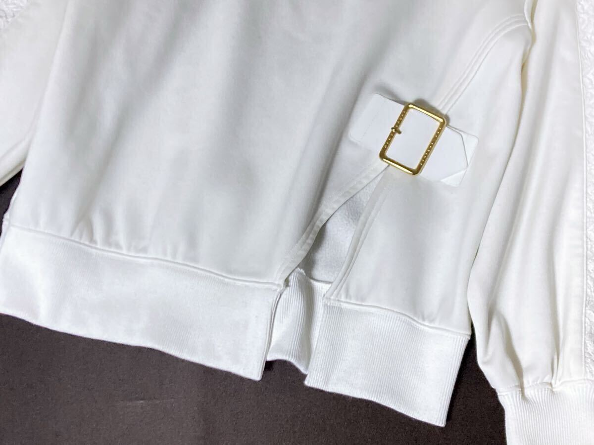 お袖のレース切替えにサイドの飾りベルトがおしゃれなアシンメトリーデザインのプルオーバーです。本体は裏起毛のダンボール素材で暖かいです。飾りベルトのバックルにブランドロゴが刻印されています。