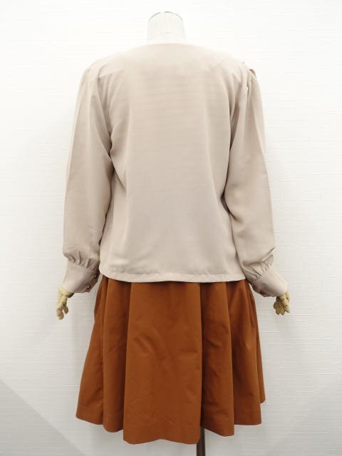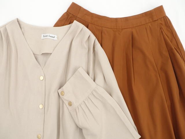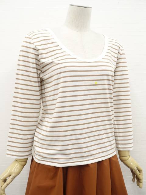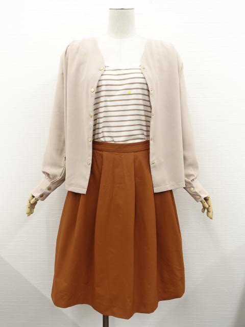 長袖シャツジャケット+長袖カットソー+ひざ丈タックフレアスカート コーディネート上下3点セット M相当 ベージュ/ホワイト×ブラウン系 ボーダー柄/ブラウン カジュアル・きれいめ系 30代・40代