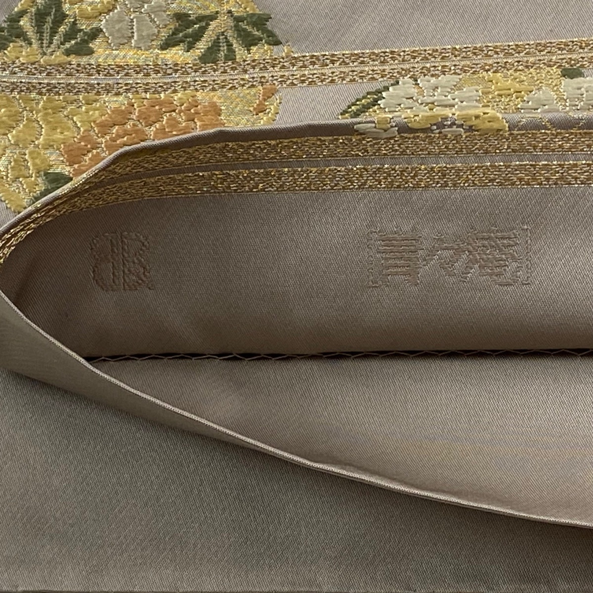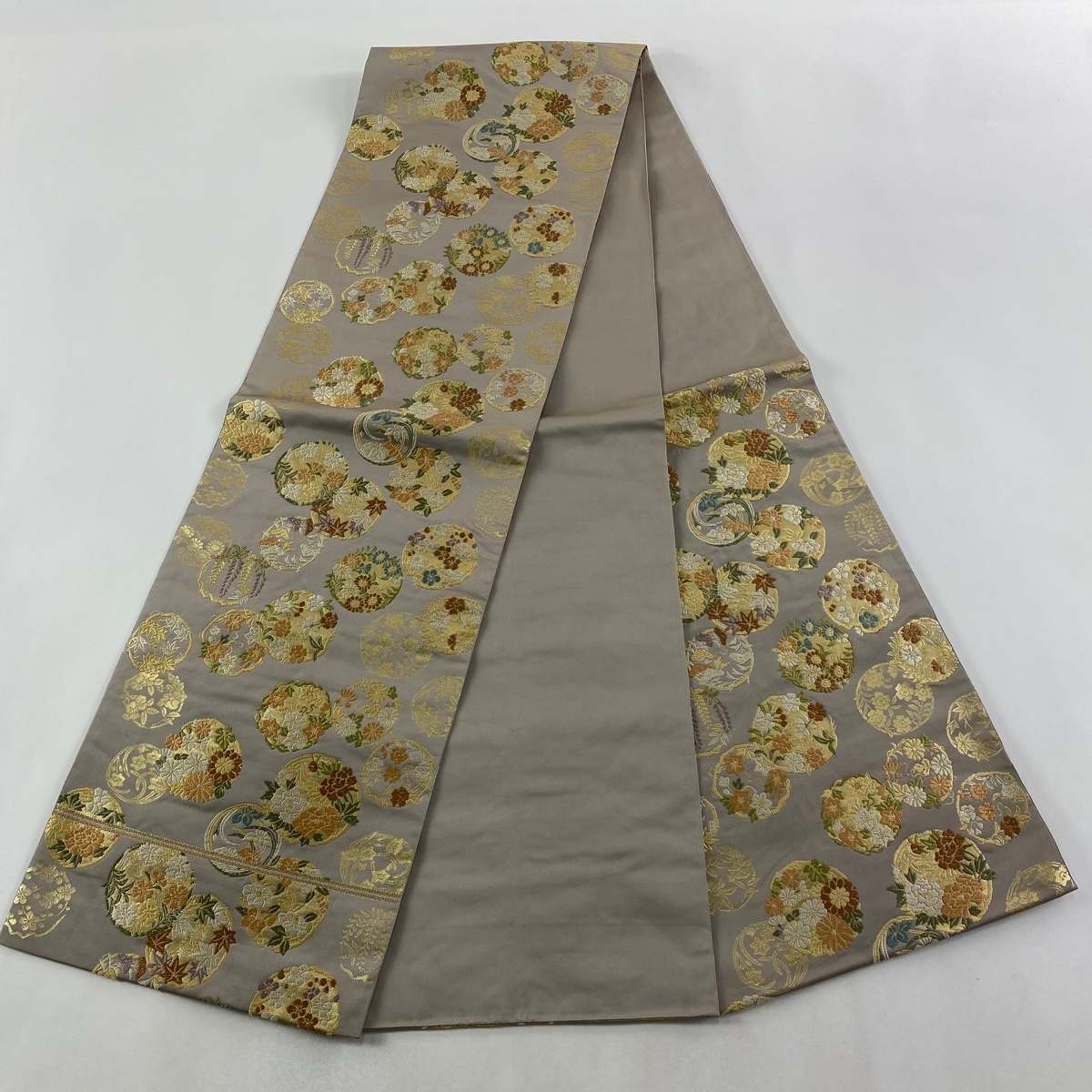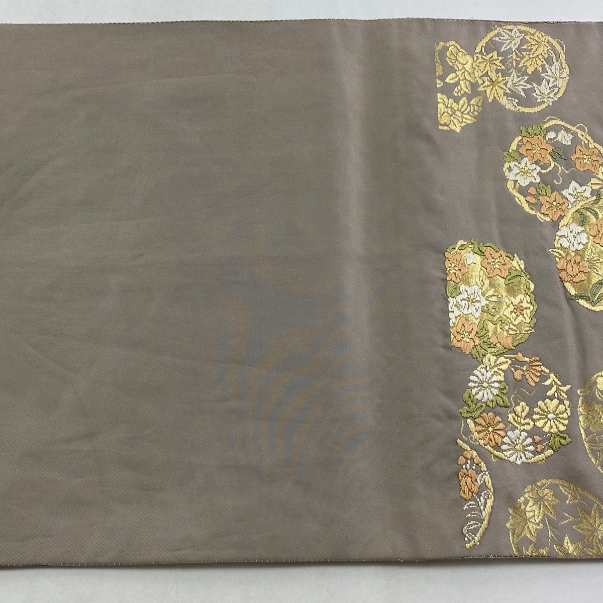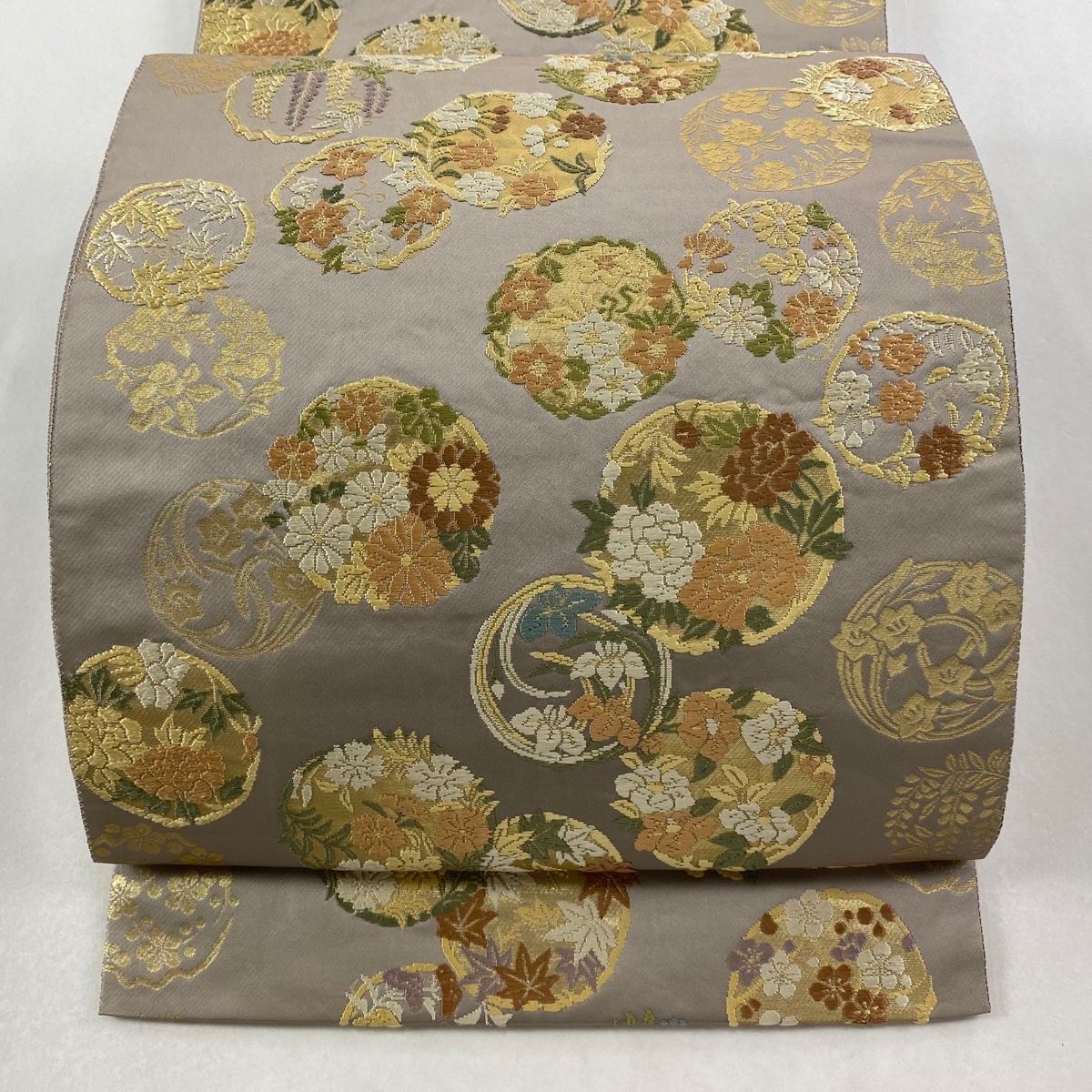 | 袋帯 逸品 服部織物 落款 青々庵 花丸文 楓 箔 灰色 六通 正絹 【中古】 |