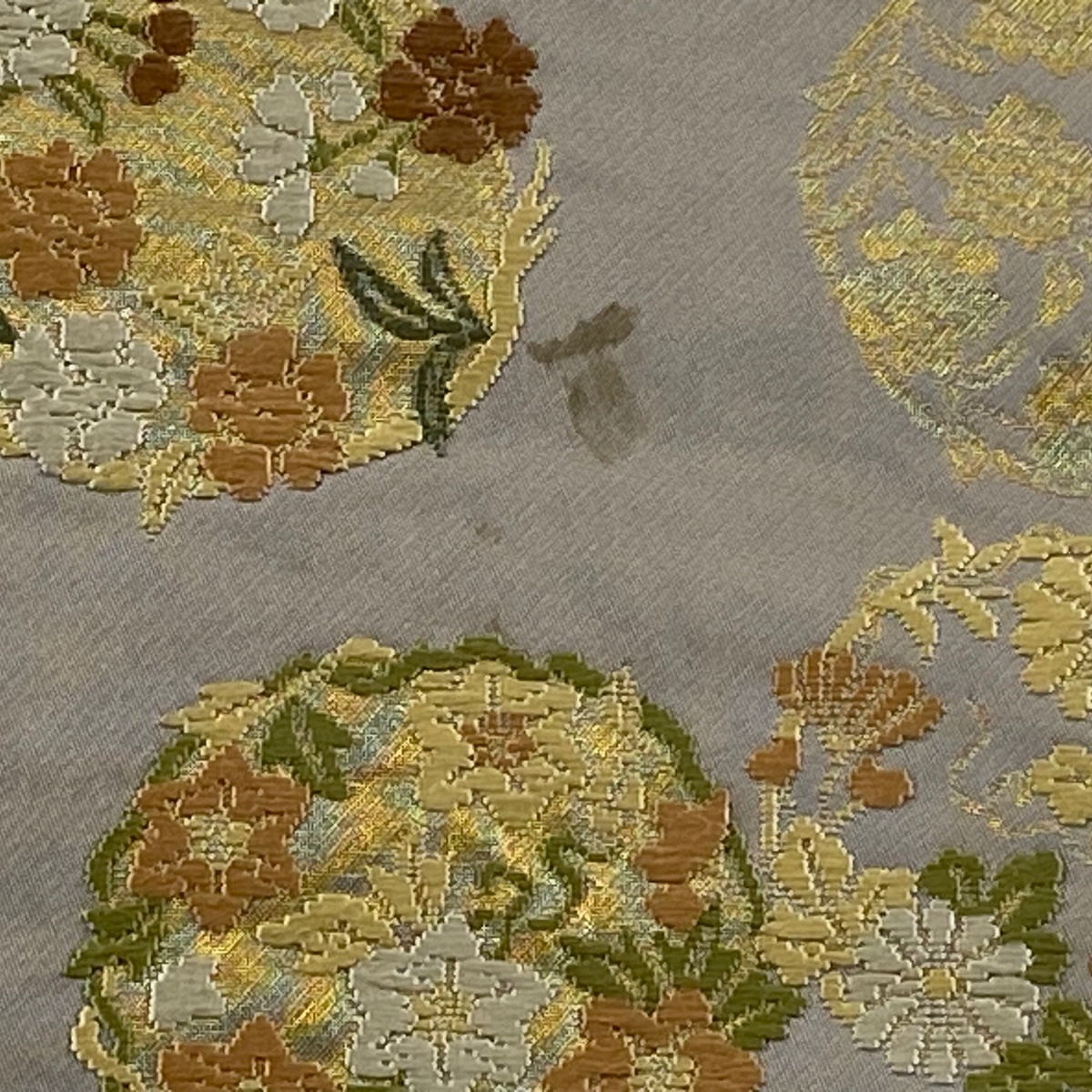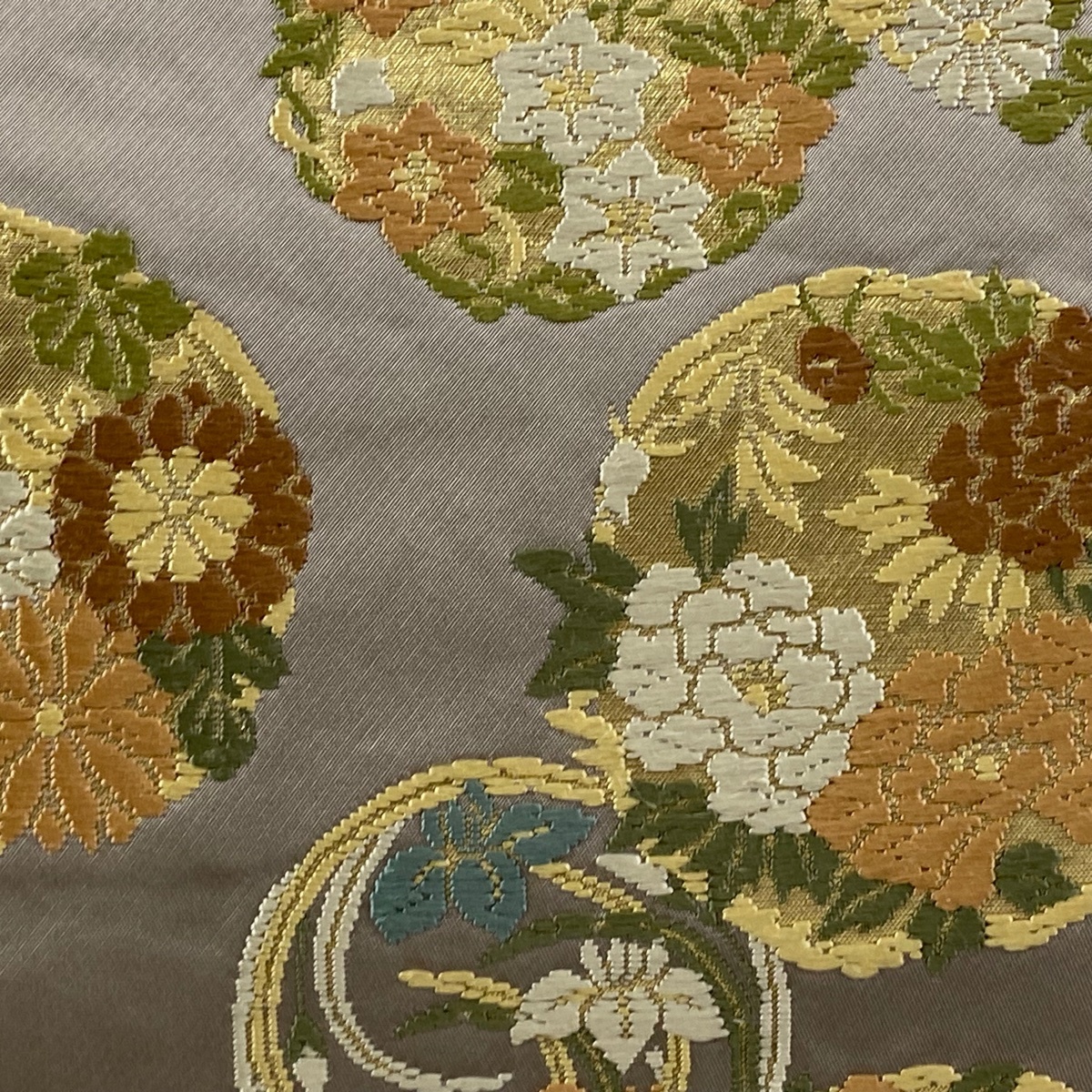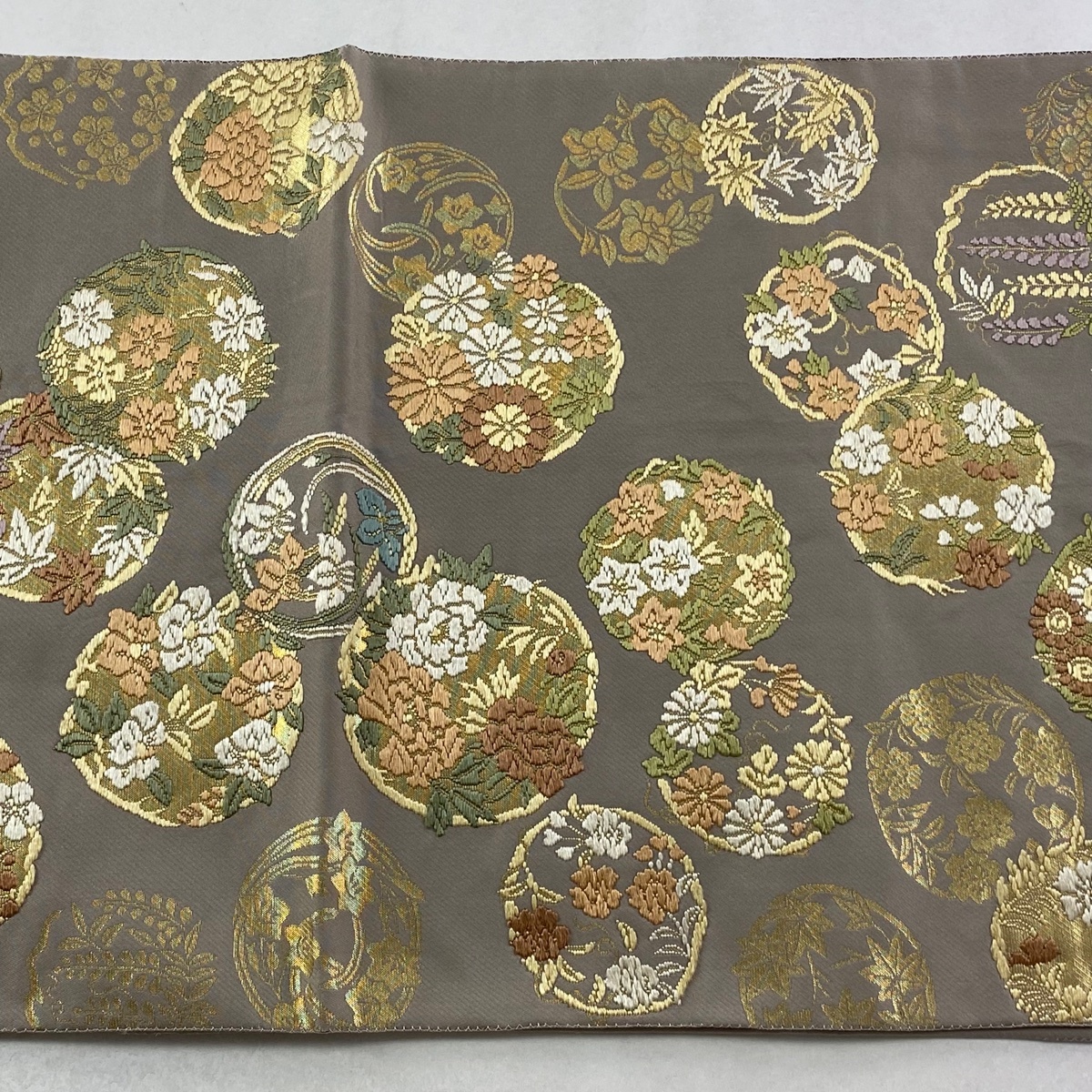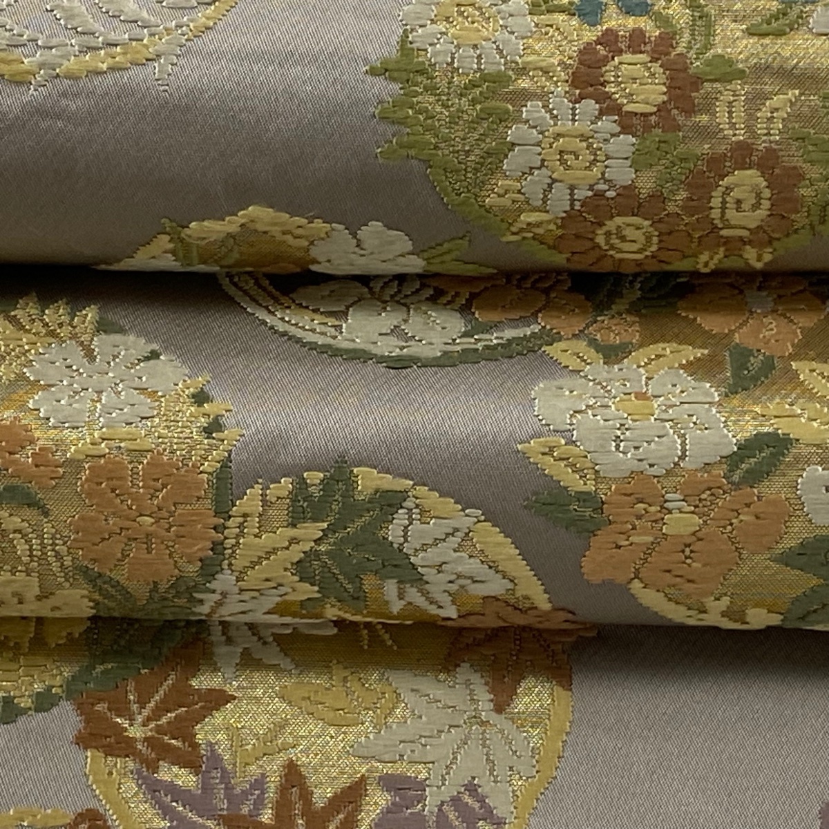 | 袋帯 逸品 服部織物 落款 青々庵 花丸文 楓 箔 灰色 六通 正絹 【中古】 |