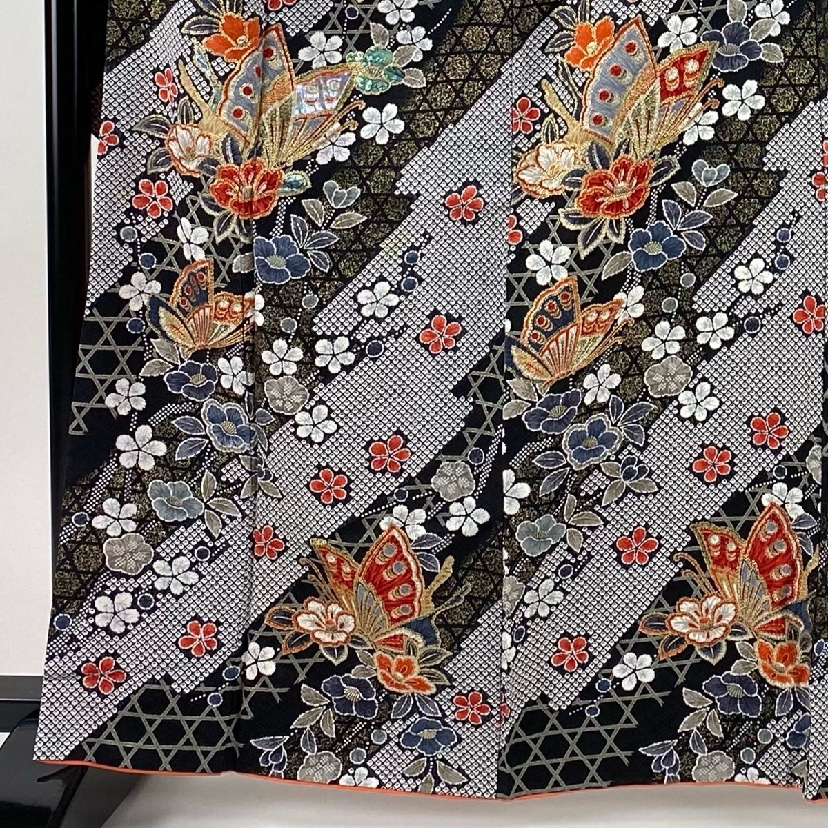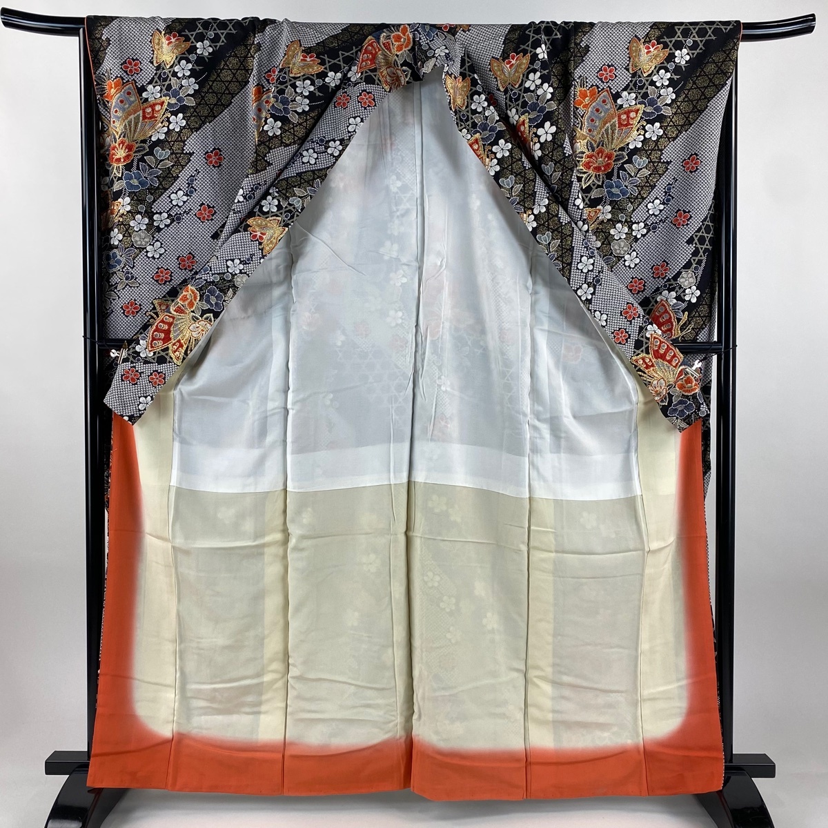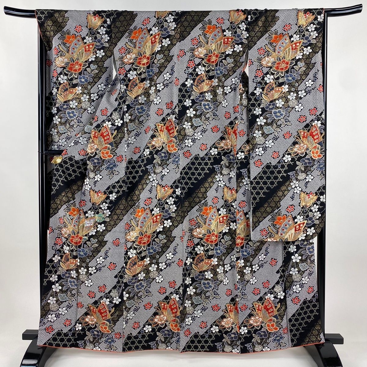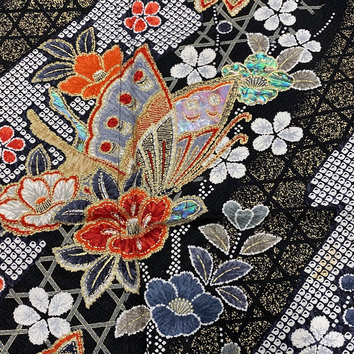 | 振袖 秀品 蝶 椿 螺鈿 金彩 黒 袷 身丈163.5 裄丈66 M 正絹 【中古】 |