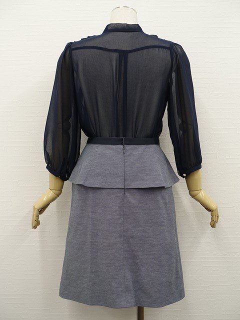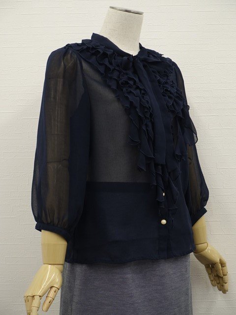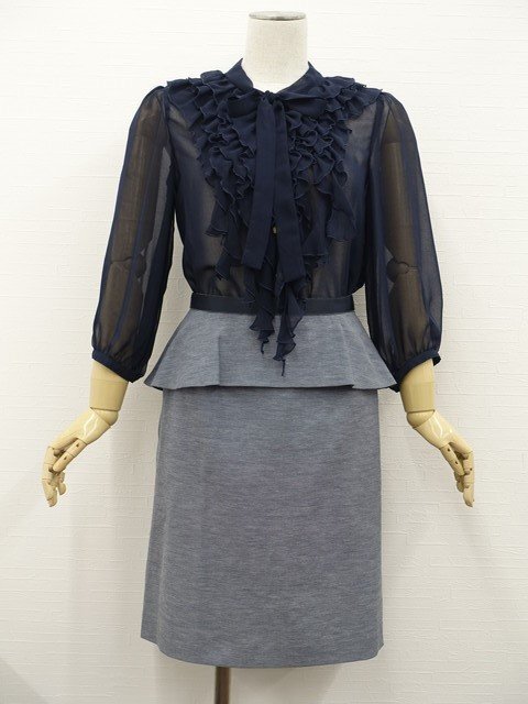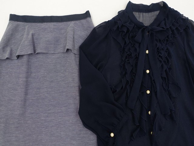 七分袖シフォンブラウス+ひざ丈フリル付きタイトスカート コーディネート上下2点セット M相当 ネイビー/ネイビー×ホワイト フェミニン・きれいめ系 20代・30代~