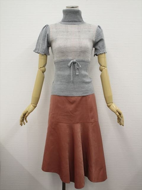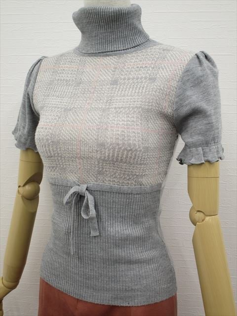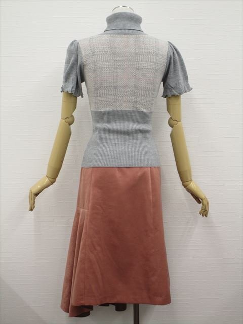 半袖タートルカットソー+ひざ丈ヘムスカート コーディネート上下2点セット S相当 グレー&グレー×ホワイト×ピンク チェック柄/ピンク系 フェミニン系 30~40代
