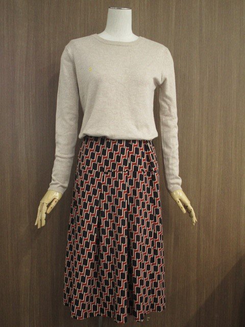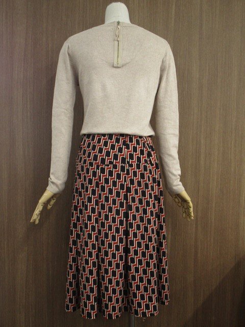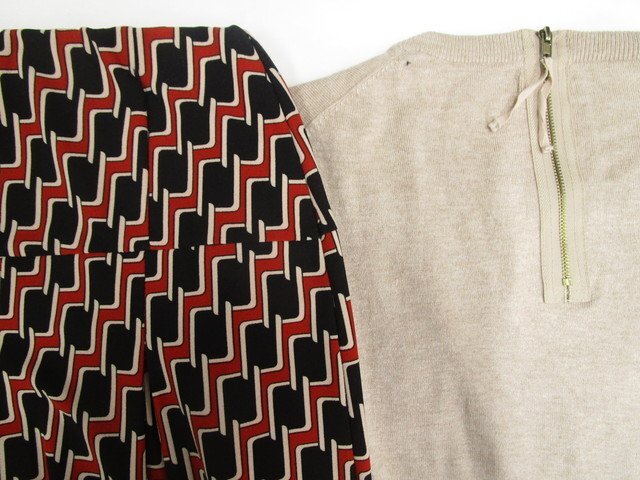 洗える長袖ニットカットソー+ひざ丈ヨークタックスカート コーディネート上下2点セット M相当 ベージュ杢/レッド系地 ブラック×アイボリー 総柄 フェミニン・きれいめ系 30代~40代