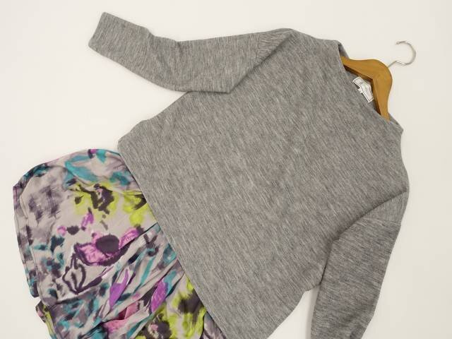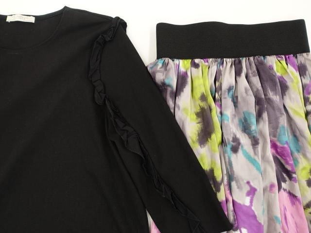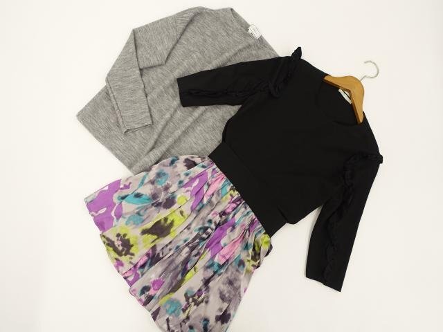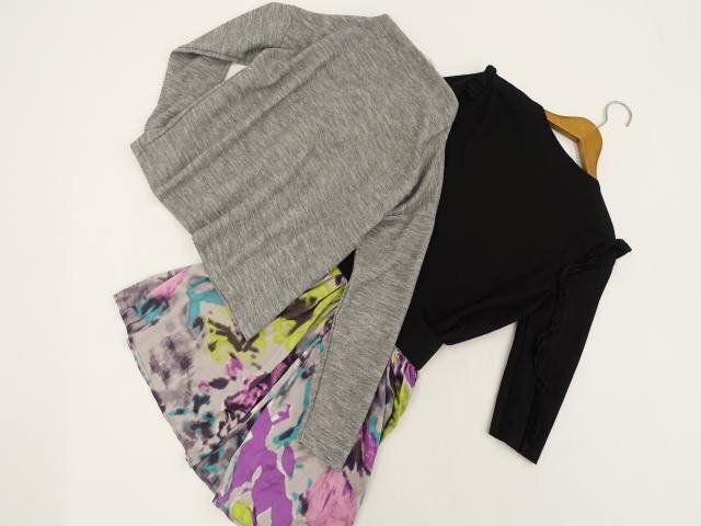 洗える7分袖カットソー+長袖カットソー+ミニ丈ギャザースカート コーディネート上下3点セット M相当 ブラック/グレー杢/グレー地 パープル×ピンク××ライトグリーン 総柄 クール・ガーリー系 20代