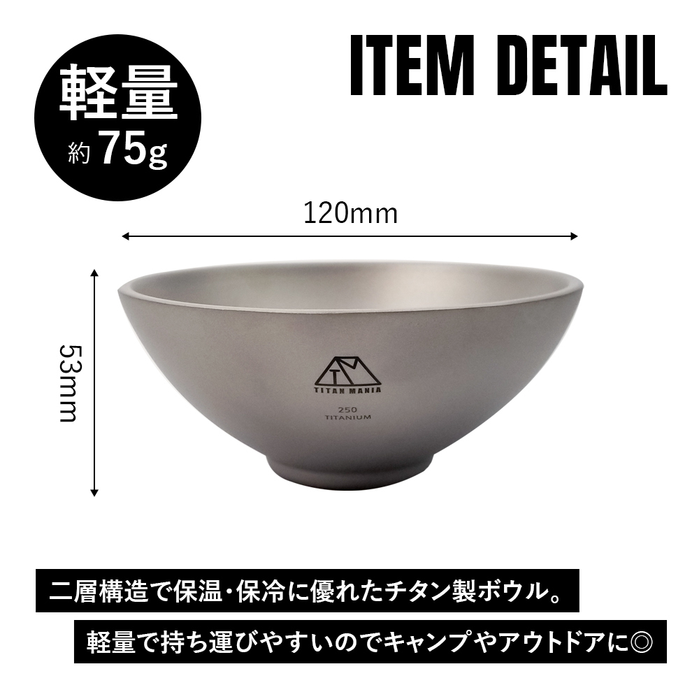 ■軽量!頑丈!サビにも強い!二重構造(ダブルウォール)で保温・保冷に優れたチタン製お茶碗。軽量で持ち運びやすいのでキャンプやバーベキュー、バイクツーリング、登山や釣りなどアウトドアに◎ チタンは鉄や銅など他の金属と比べて頑丈!軽量でサビにも強く、金属臭が少ない金属なので、アウトドアの食器にはチタン製品がおすすめ!