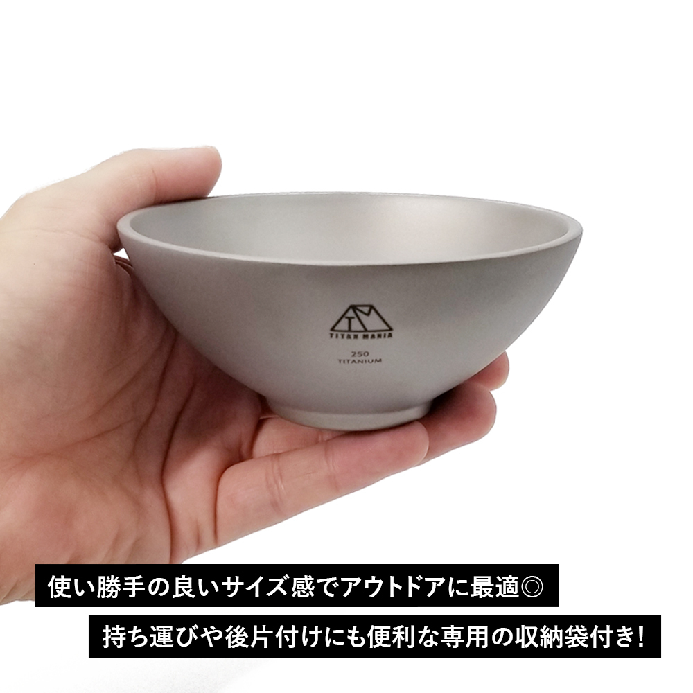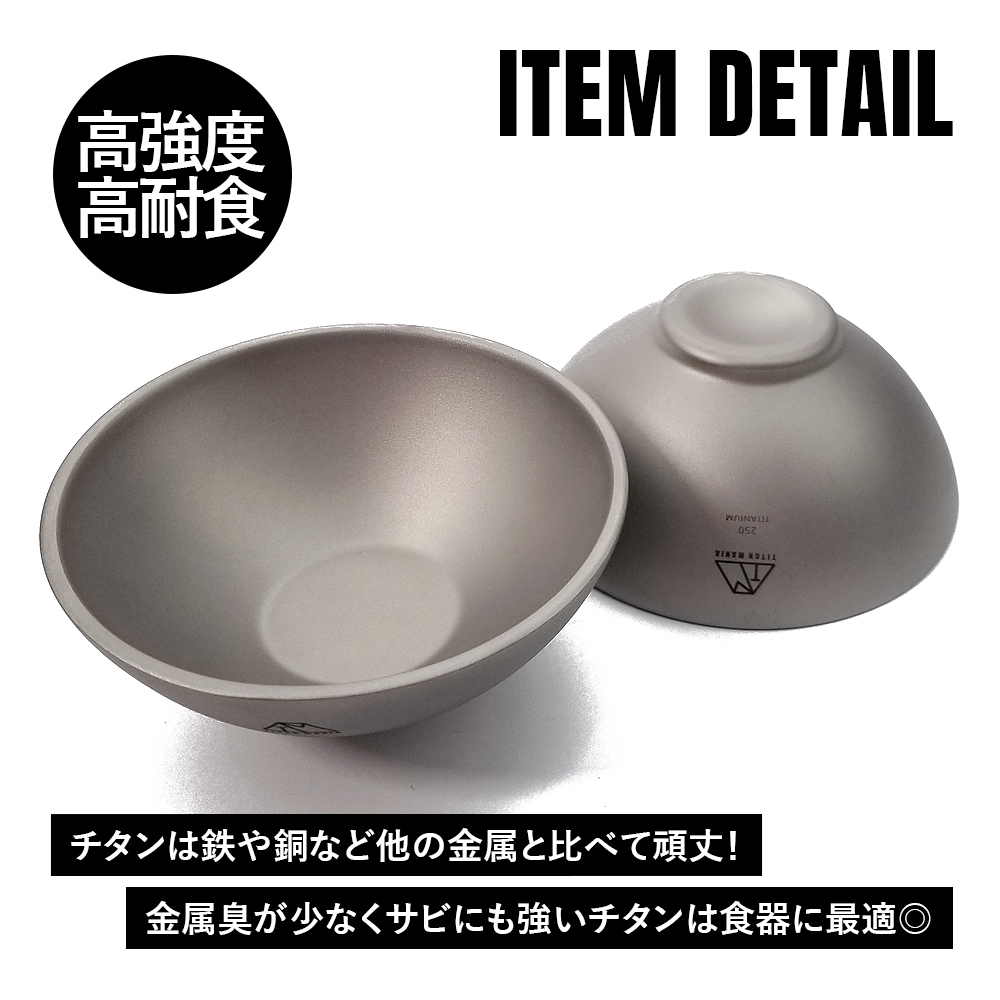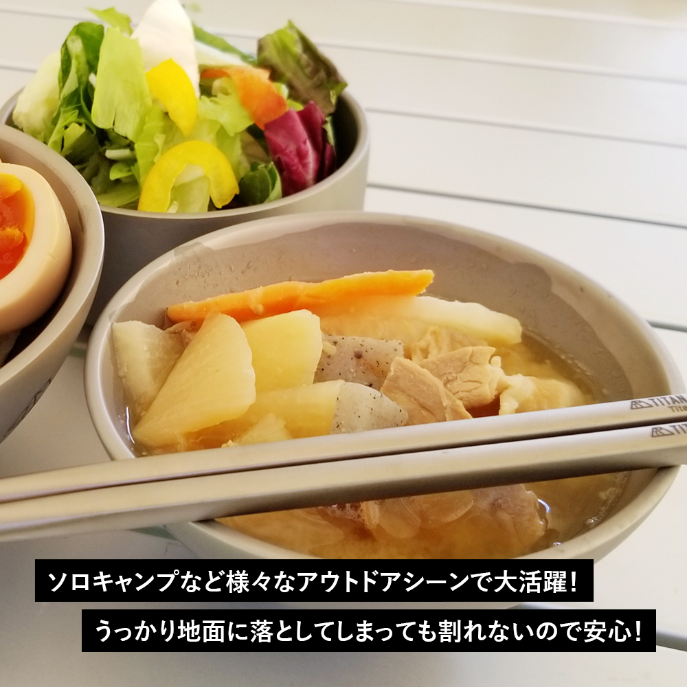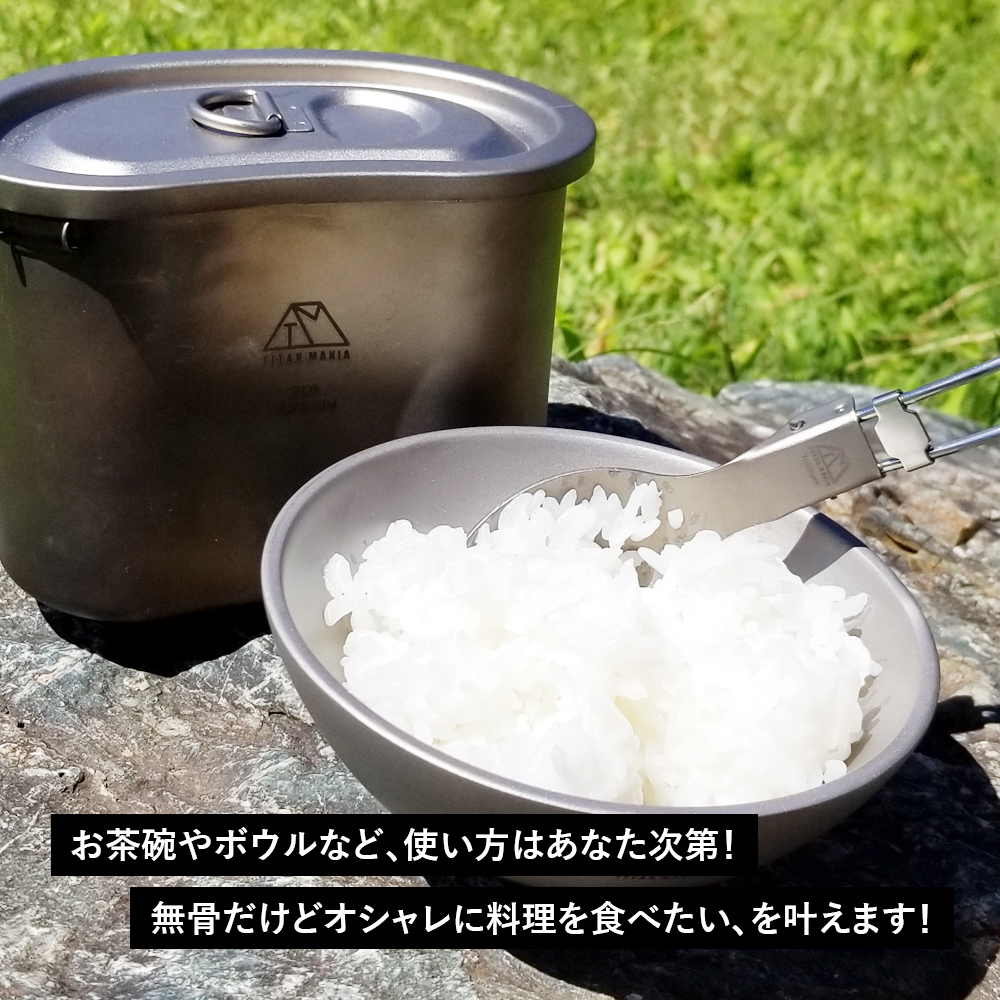 ■ご飯だけではなくスープなどの汁物、ちょっとした小皿としても使えるサイズ感。野外での使用も落して割れることがないので安心! 丼鉢としてはもちろん、ボウルやお皿、コップやカップにもなる、使い方はあなた次第の優れモノ!無骨にオシャレに料理を食べたい、を叶えるチタン製のお茶碗。