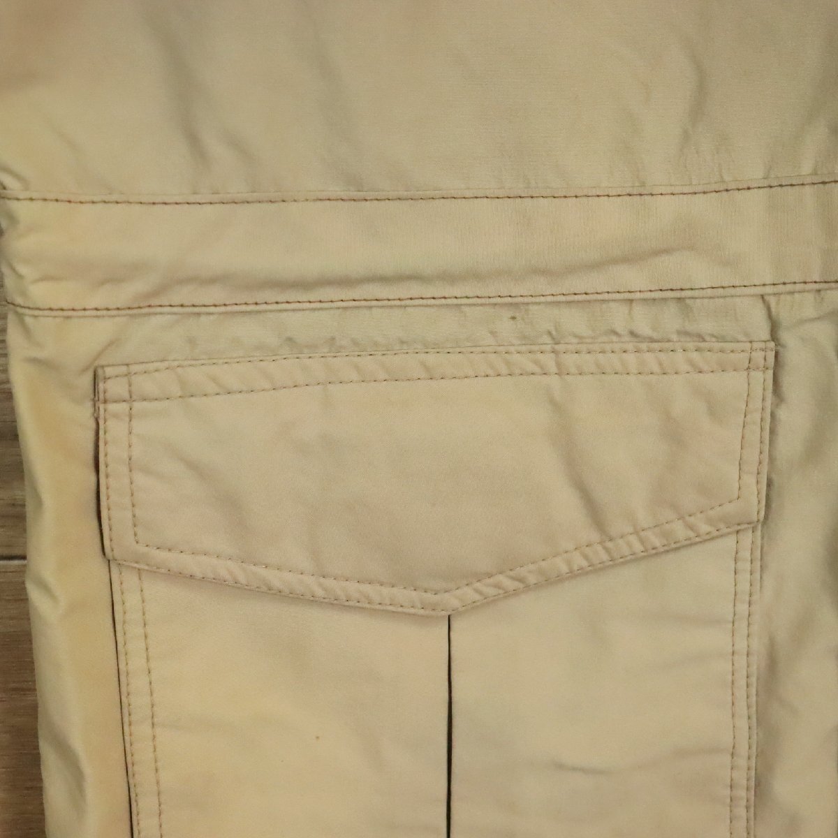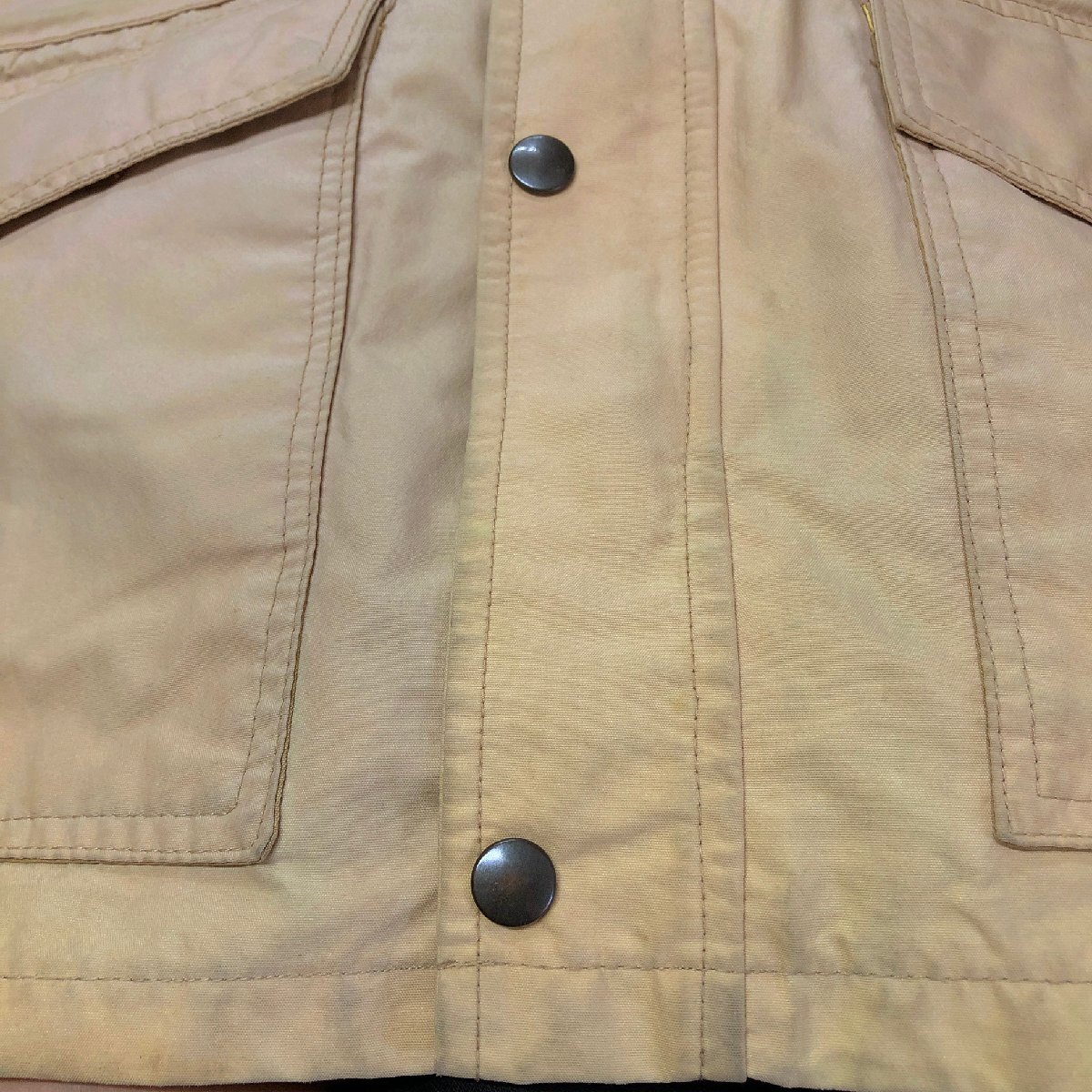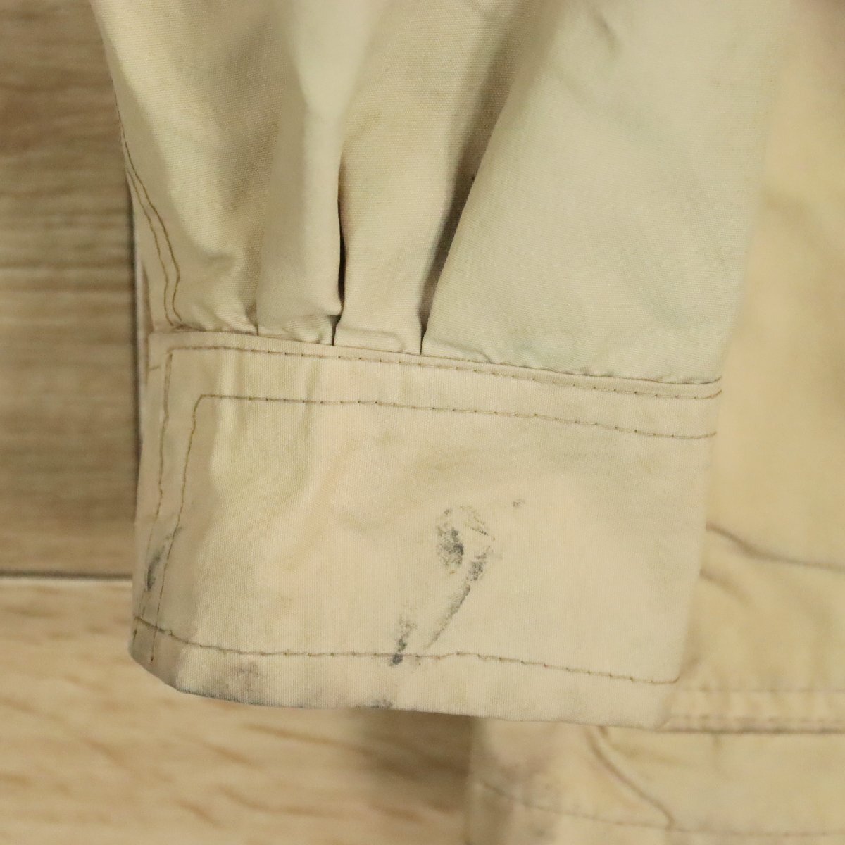 中古品です。使用感があります。写真にあるように袖に汚れ、腹部に薄汚れ、裏地やボディに色あせがあります。