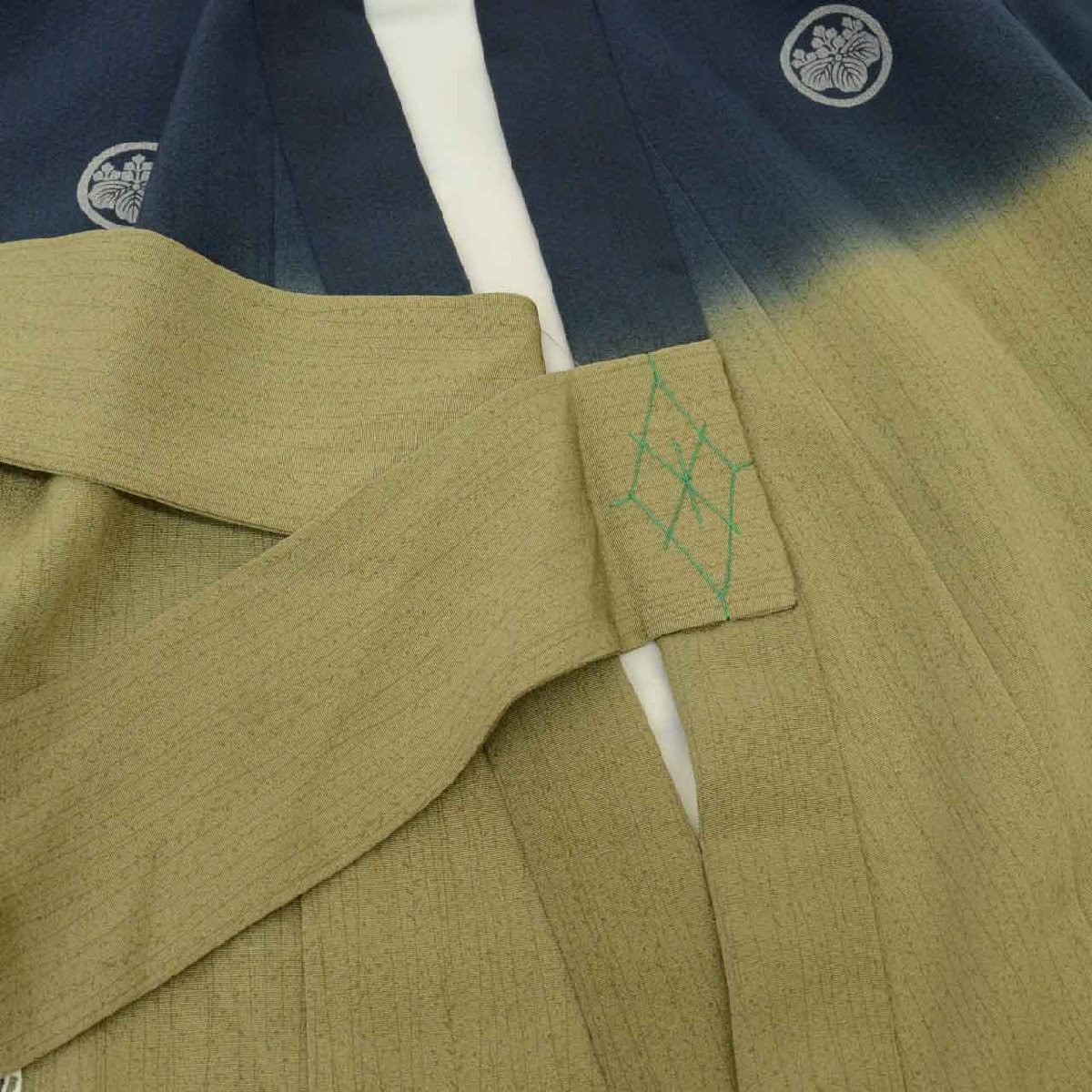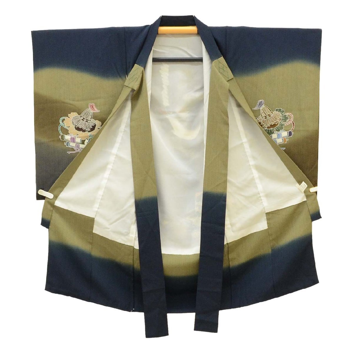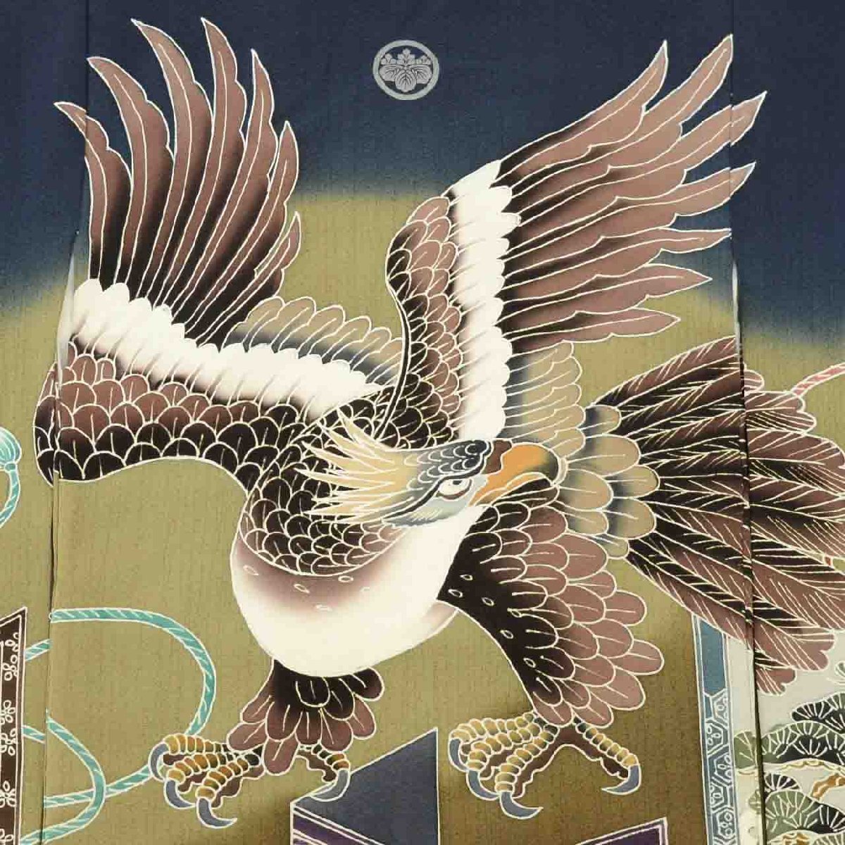 男の子用の紺と茶色に鷹や宝づくし文様が施された、古典的なリサイクル一つ身です。