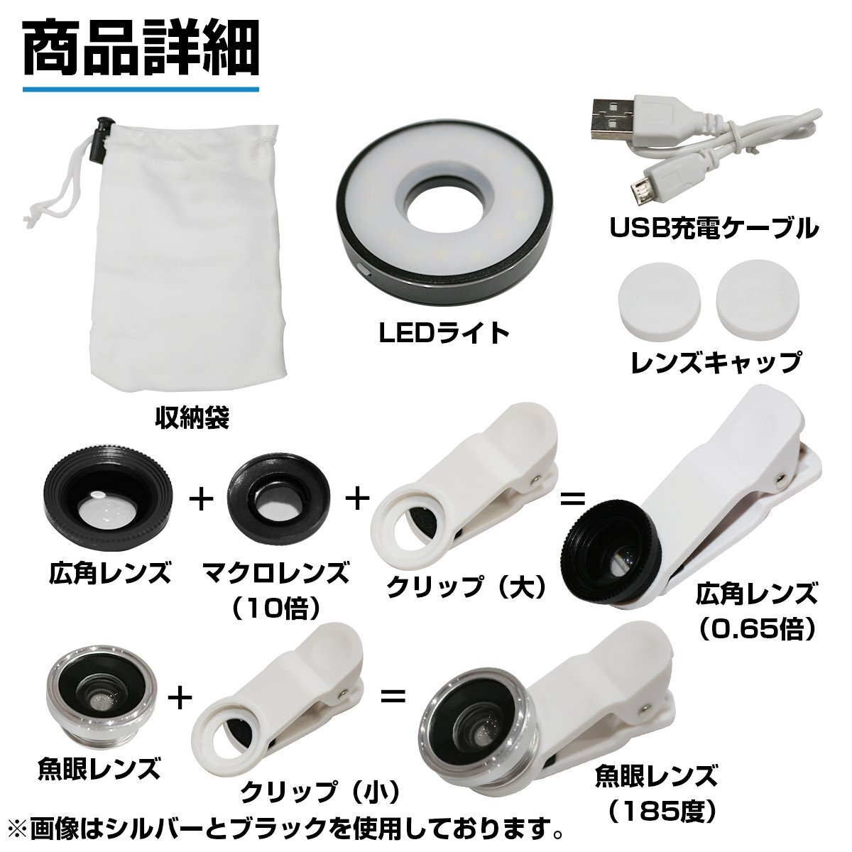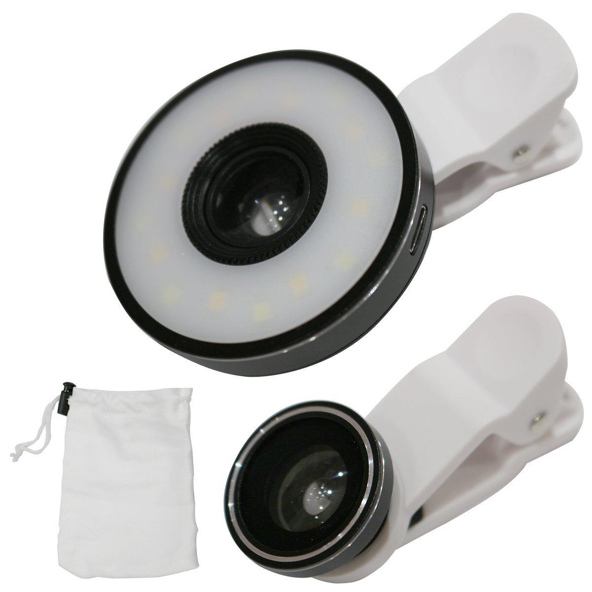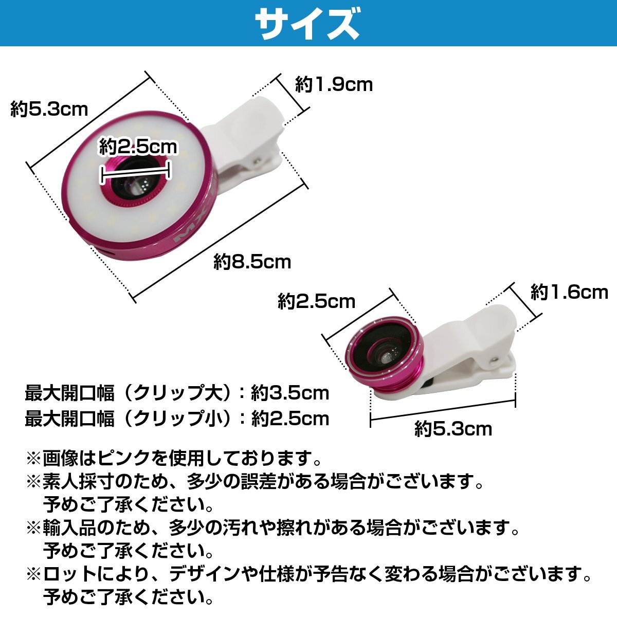『訳アリ』自撮り用 LEDライト レンズキット クリップ式 3段階調整 ブラック/黒 『セルカレンズ 魚眼レンズ 広角レンズ マクロ』