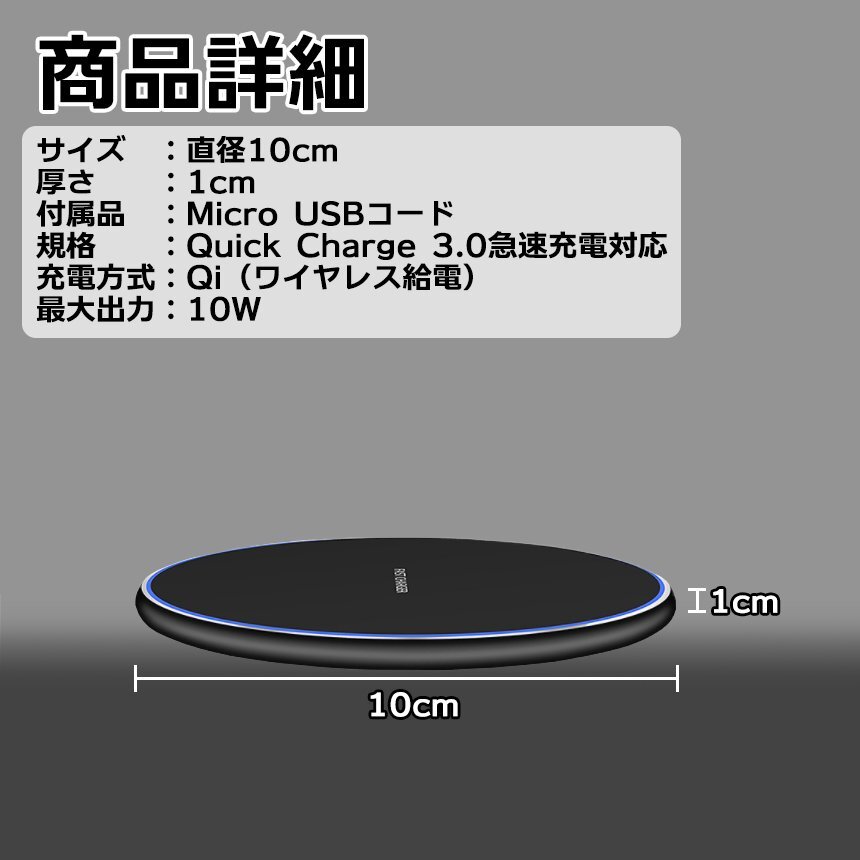 | 送料無料!!! 送料及び下記のご案内をご確認の上、ご入札お願い致します。 離島地域を除く九州、四国、本州まで送料無料。 ※北海道は+1000円、離島地域及び沖縄県は+3000円にて承ります。(発送前に加算) ※画像内にカラー及びサイズ等の選択が可能と記載がある場合がございますが、 お届けする物はタイトルまたは商品説明文に記載の物です。 ★※注文後のカラー変更や異なるカラー・サイズ指定等は一切承っておりません。 ※★※仕様(ロゴデザイン/ロゴ有無等も含む)は予告なく変更する場合があります。 ※多少の汚れや小傷がある場合がございますがご了承ください。 梱包は簡易包装ですので、箱の角落ち等はご了承願います。 【商品説明】 置くだけで充電できるQi対応ワイヤレス充電器! Quick Charge3.0に対応した最大10W出力の急速充電対応 形状が平らなので360度どの方向からでも設置可能でストレスフリー 通電時に青色、充電時に緑色にリング上のLEDが光って教えてくれるので うっかり充電ができてなかったなんてことは起きません。 95%まで充電されると自動的に充電モードを切り替え 過充電を防ぎ、バッテリーの劣化を抑えられる親切設計♪ 背面には滑り止め用にゴムパッドがついています。 設置時にはフィルムを剥がしてご使用ください。 ======================================== 【商品仕様】 数量:1枚 サイズ:直径10cm 厚さ1cm カラー:ブラック 付属品:Micro USBケーブル ※日本語説明書は付属しておりません。 ※携帯端末のケースの種類により充電速度低下や充電不可な場合がございます ※充電動作が確認できない場合はケースを外しての充電や別携帯端末での充電をお試しください ※モニターにより色合いが若干前後する場合がございます。 ※輸入品ですので多少の臭いやスレ傷、汚れはご了承ください。 ※サイズは実寸ですが若干前後する場合がございます。 ※在庫情報の表示については万全を期しておりますが、 注文のタイミングによっては「在庫あり」と表示されていた場合でも、 実際には在庫切れとなっていることがございます。 その場合、代替案や次回入庫時期を速やかにお伝えいたしますので、 ご了承いただきますようお願い申し上げます。 ======================================== ※詳細は画像にてご確認ください ![]() ![]() ![]() ![]() ![]() ![]() ![]() |