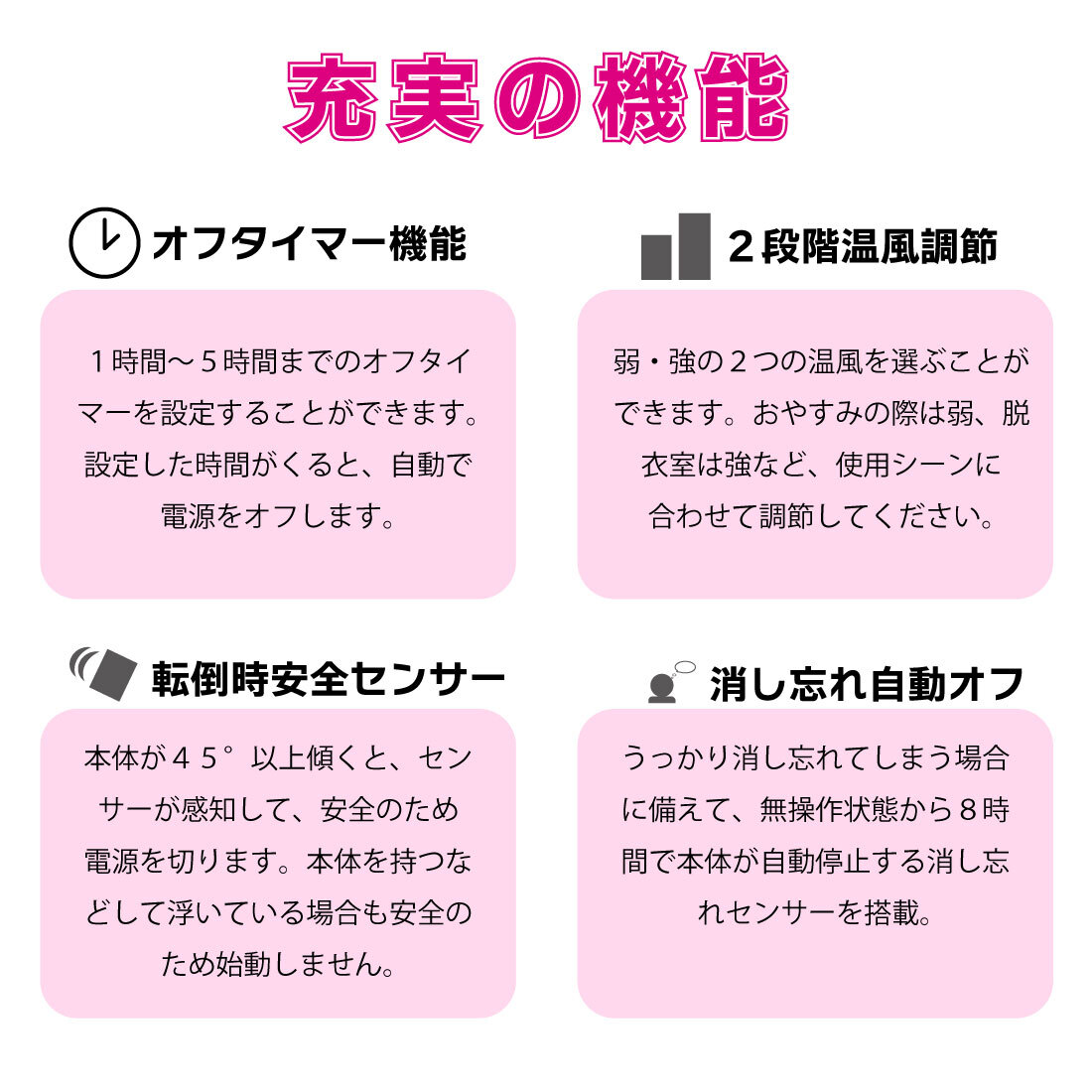 安心・安全機能:過熱防止・転倒時オフ安全装置付き。お子様やご年配の方も安心。