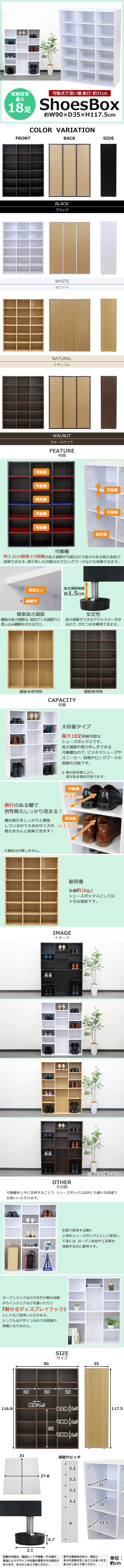 | 商品紹介 | ■最大18足の靴が収納できるシューズボックスです。 ■棚は高さ調節や取り外しができる可動式なのでビジネスシューズから長靴、ロングブーツまで収納できます。 ■棚の高さ調節は3.2cm間隔で5段階の調節が可能です。 ■奥行は約35cmとスリムなので混雑しがちな玄関に最適です。 ■可動棚を上手に活用することでシューズボックス以外にも様々な用途でお使いいただけます。 ■オープンラックなので『魅せるディスプレイラック』としてもご使用いただけます。 ※こちらの商品は組立て式です。 (組立てには、プラスドライバーが必要です。工具はお客様でご用意下さい。) ■重量:約39kg ■耐荷重:各棚約1kg ■可動棚高さ調節ピッチ:約3.2cm(5段階調節) ■材質:パーティクルボード(本体)、メラミン化粧板(本体)、ゴム(アジャスター) ■組立説明書付き ●カラーはホワイトとなります。 ●新品商品ではありますが、輸入商品の為、多少の擦り傷などがある場合がございますので、ご納得の上ご購入下さいませ。 ●ご購入後、お客様ご都合によるご返品、ご返金等は一切お受け致しておりません。 ●本商品を使用した際に発生したトラブル、事故につきまして、当社は一切の責任を負いません。ご使用に関しましては、全て自己責任にてお願い致します。 |