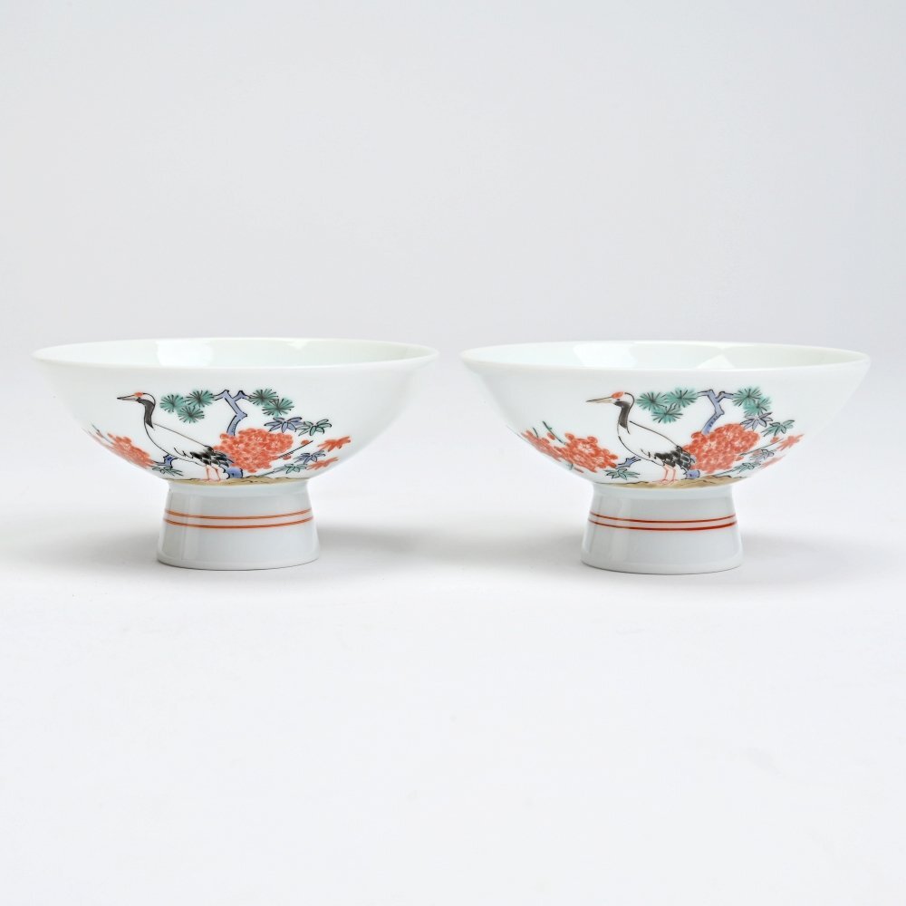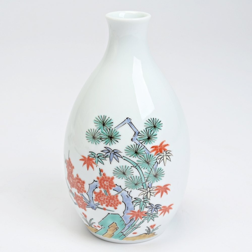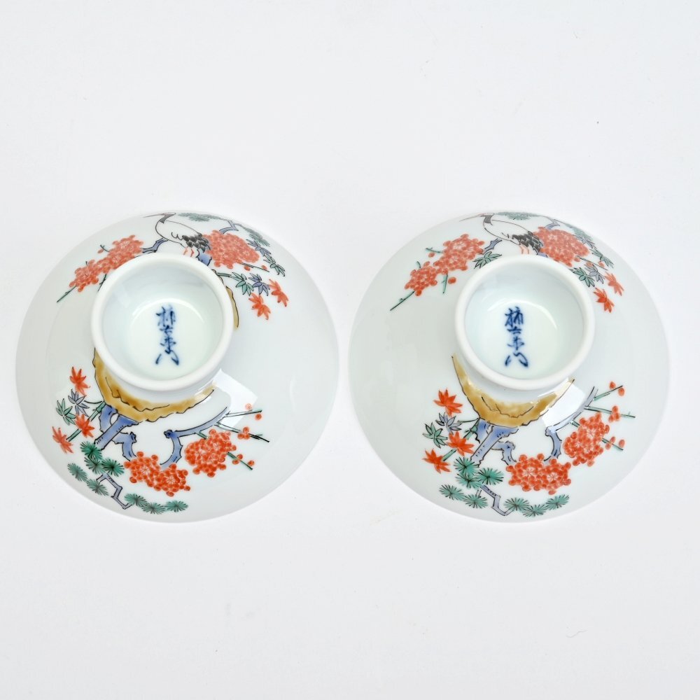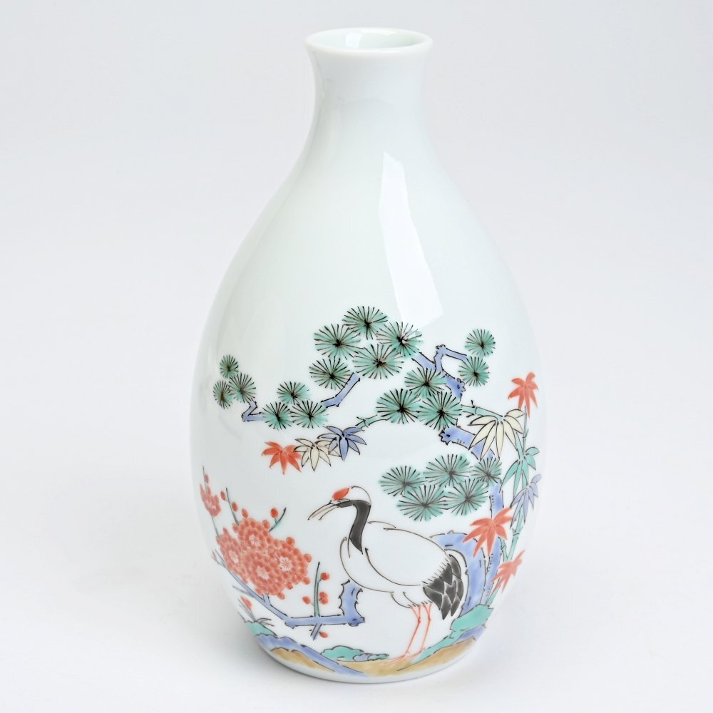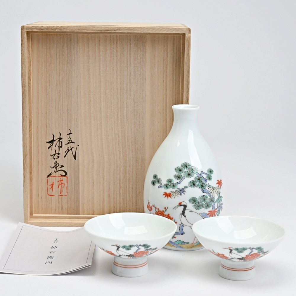 IJ2713■十五代 酒井田柿右衛門 錦 松竹梅鶴文 酒器 共箱 栞 徳利 盃×2◆h