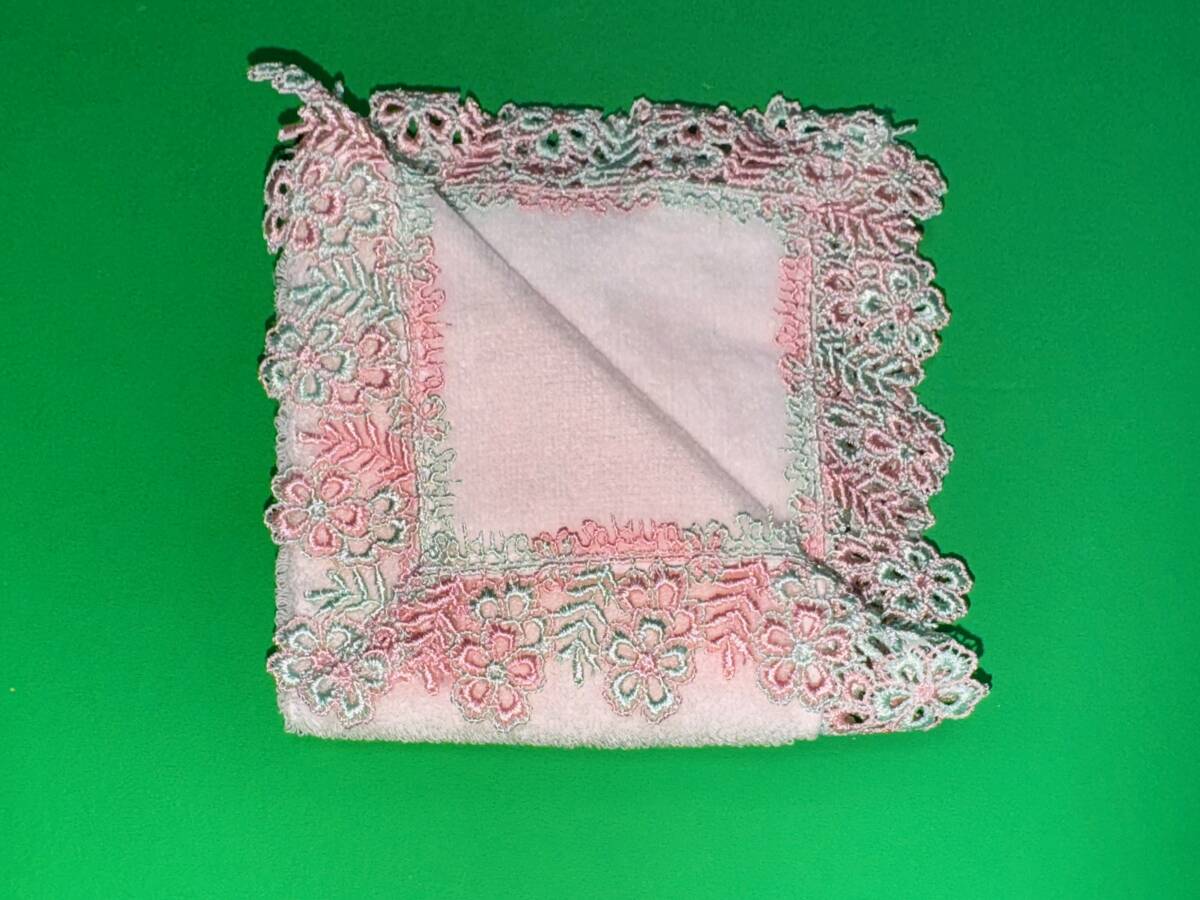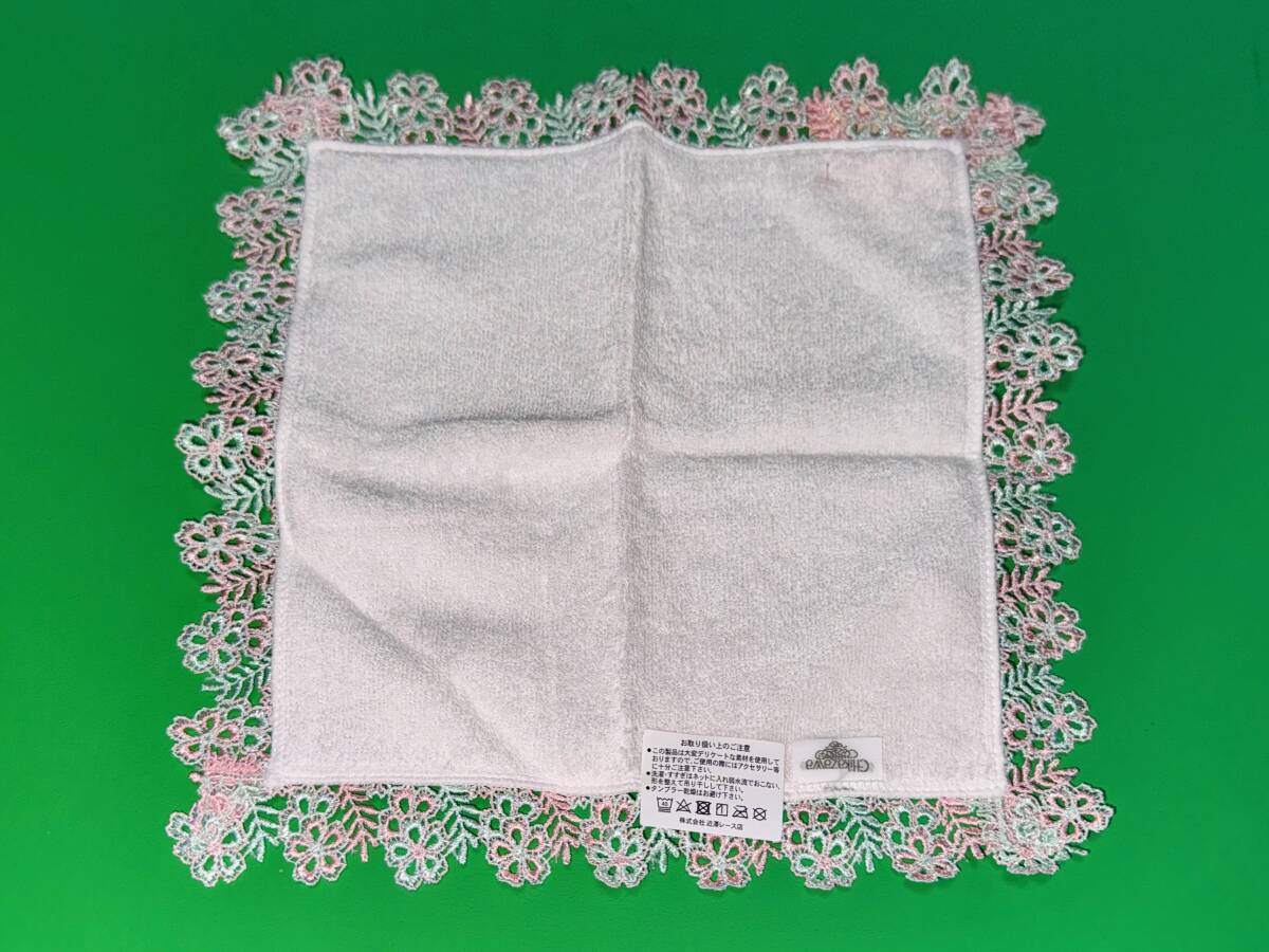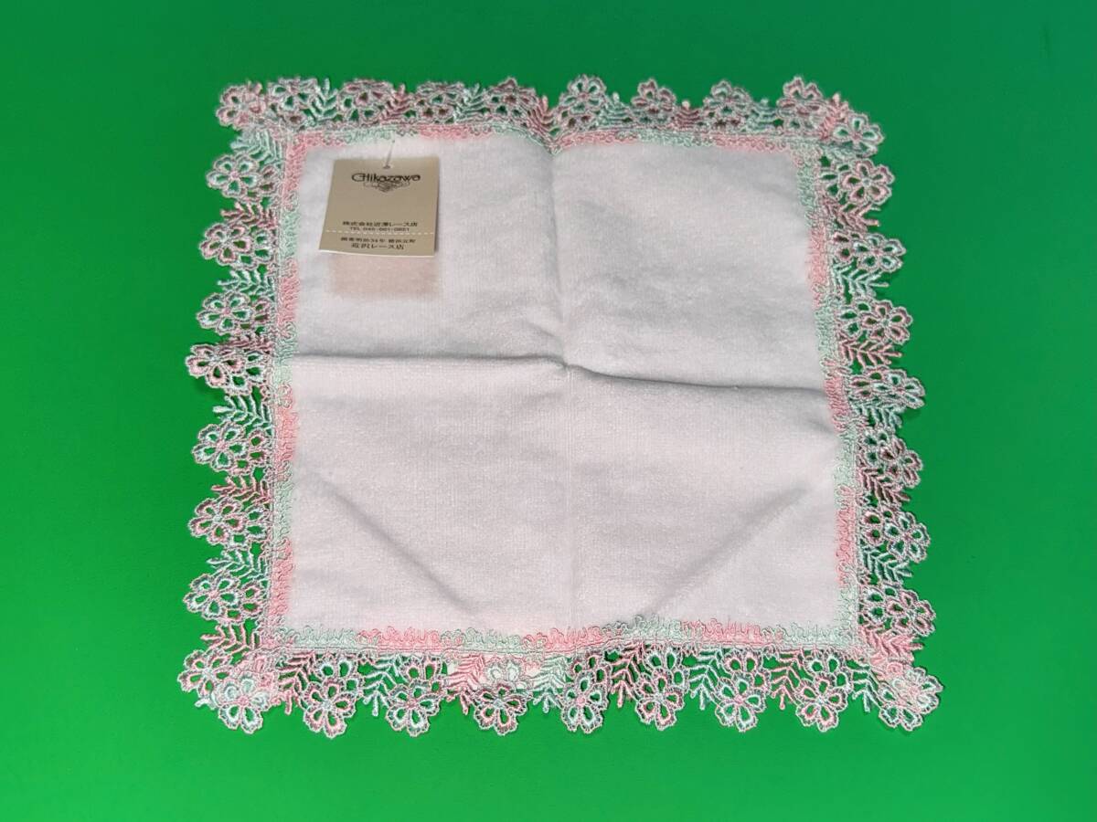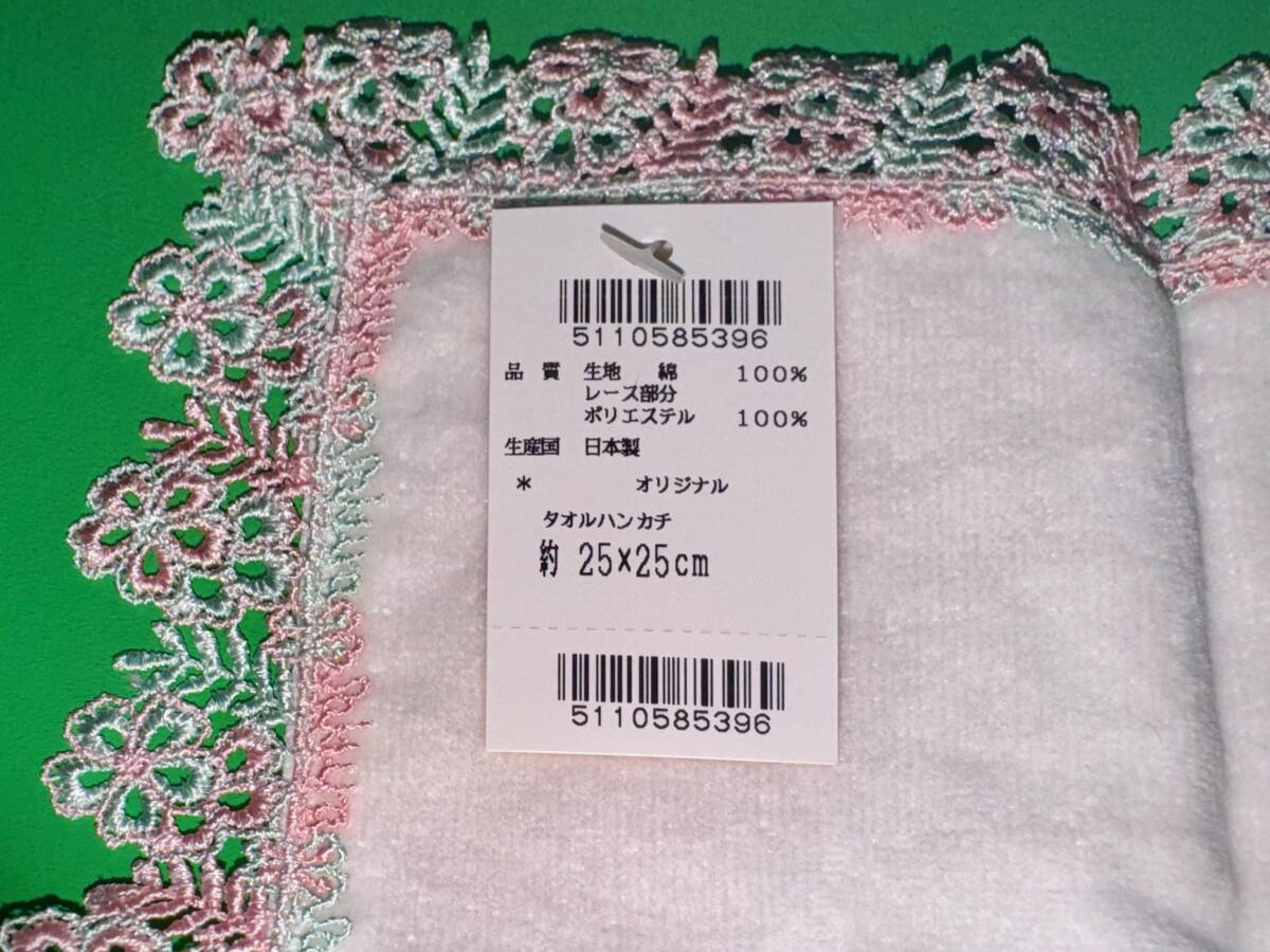 | 商品名: 『6☆入手困難未使用限定品/近沢レース(Chikazawa)/タオルハンカチ/しだれ桜/ピンク×グリーン/25×25cm/日本製/綿100%ポリエステル100%/かくし文字SAKURA入り』 |