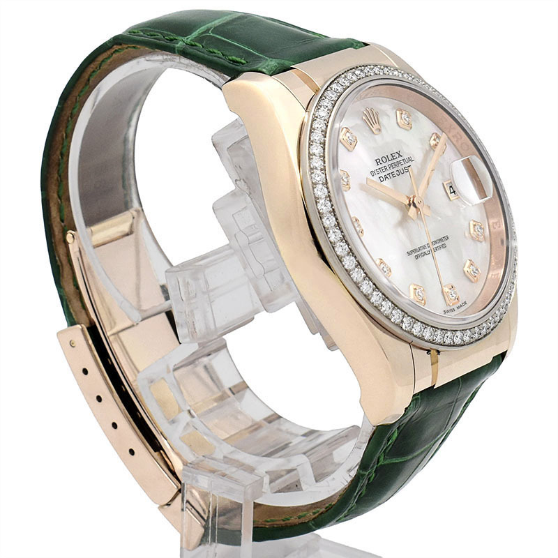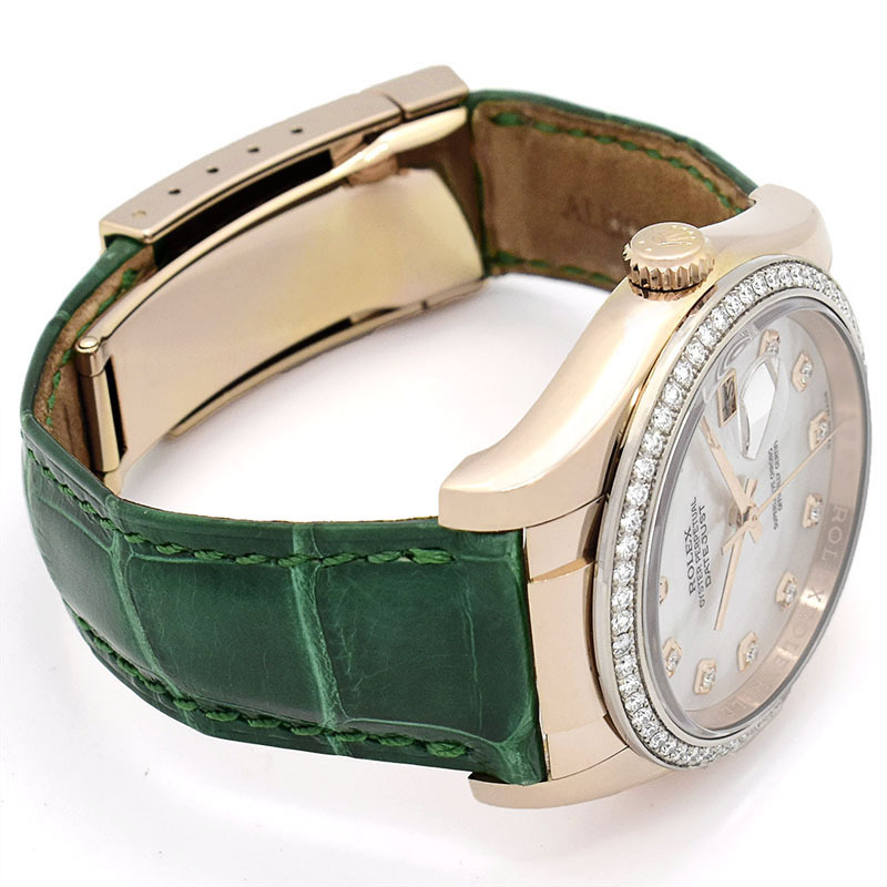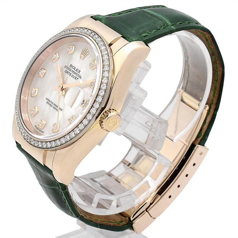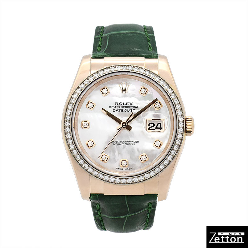 | 店長メモ | ダイヤモンドベゼルとロレックスが独自開発した合金であるエバーローズゴールドを組み合わせた上品で華やかなモデルです。 ケース径は36mmと男性でも女性でもお使い頂けるサイズ感です。 *付属の革ベルトは社外製の物になります。 |